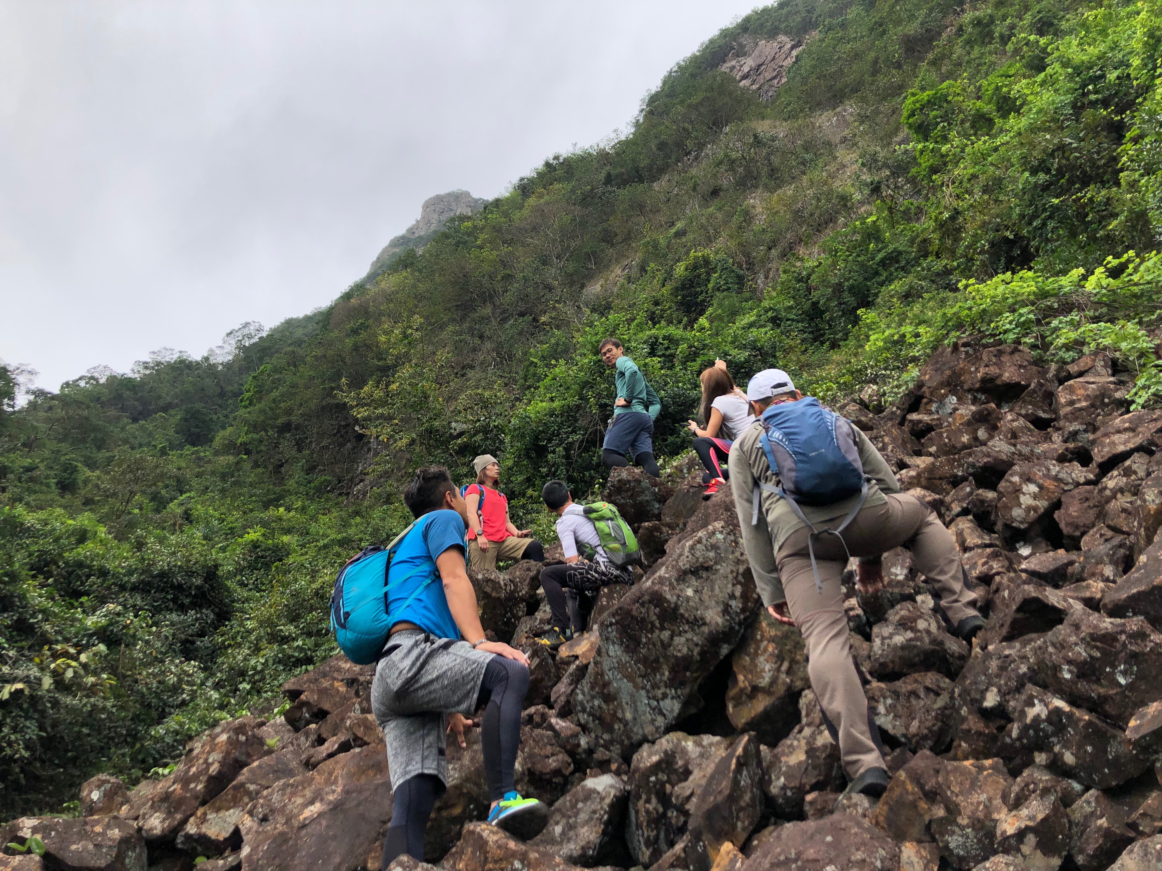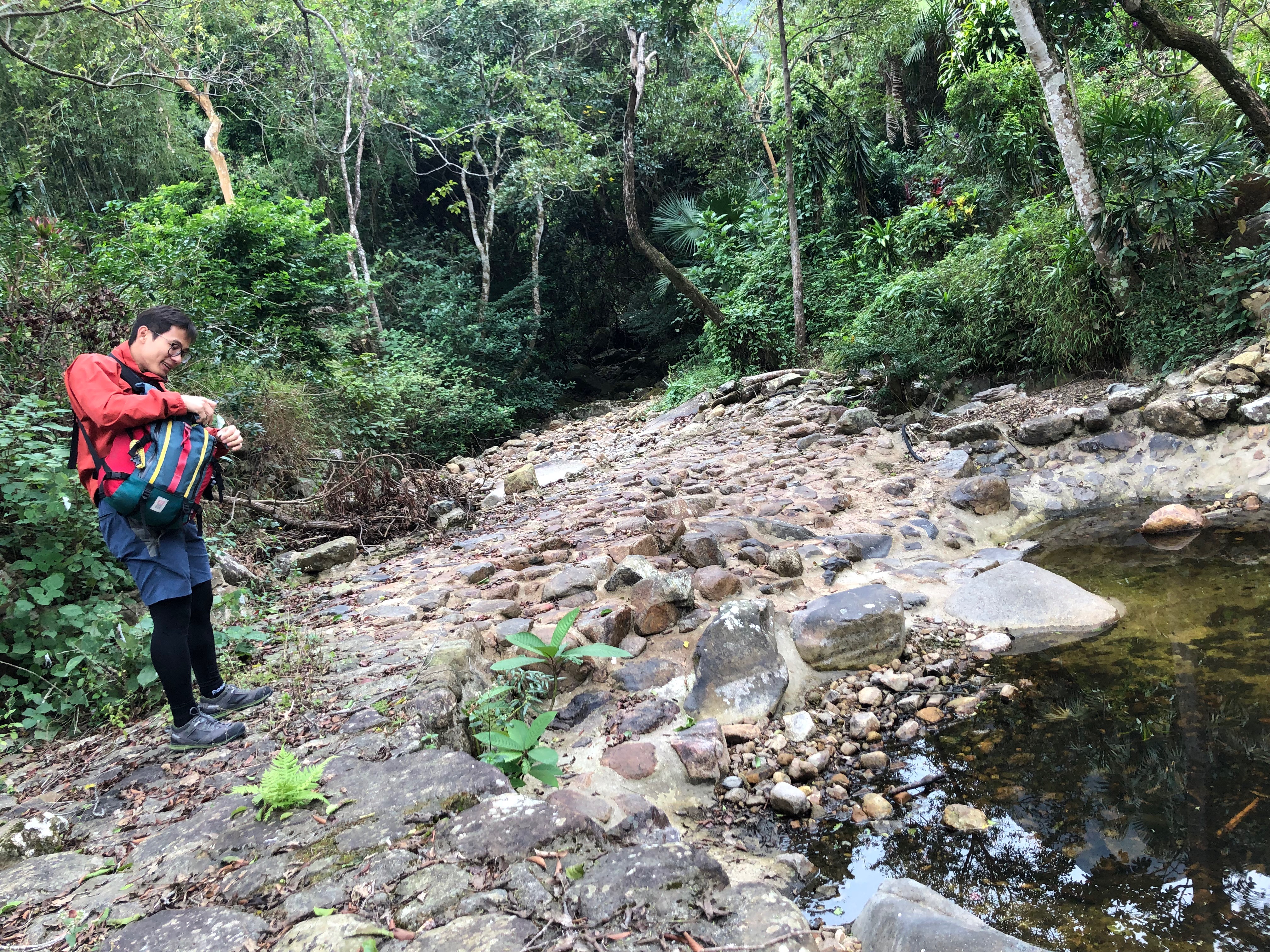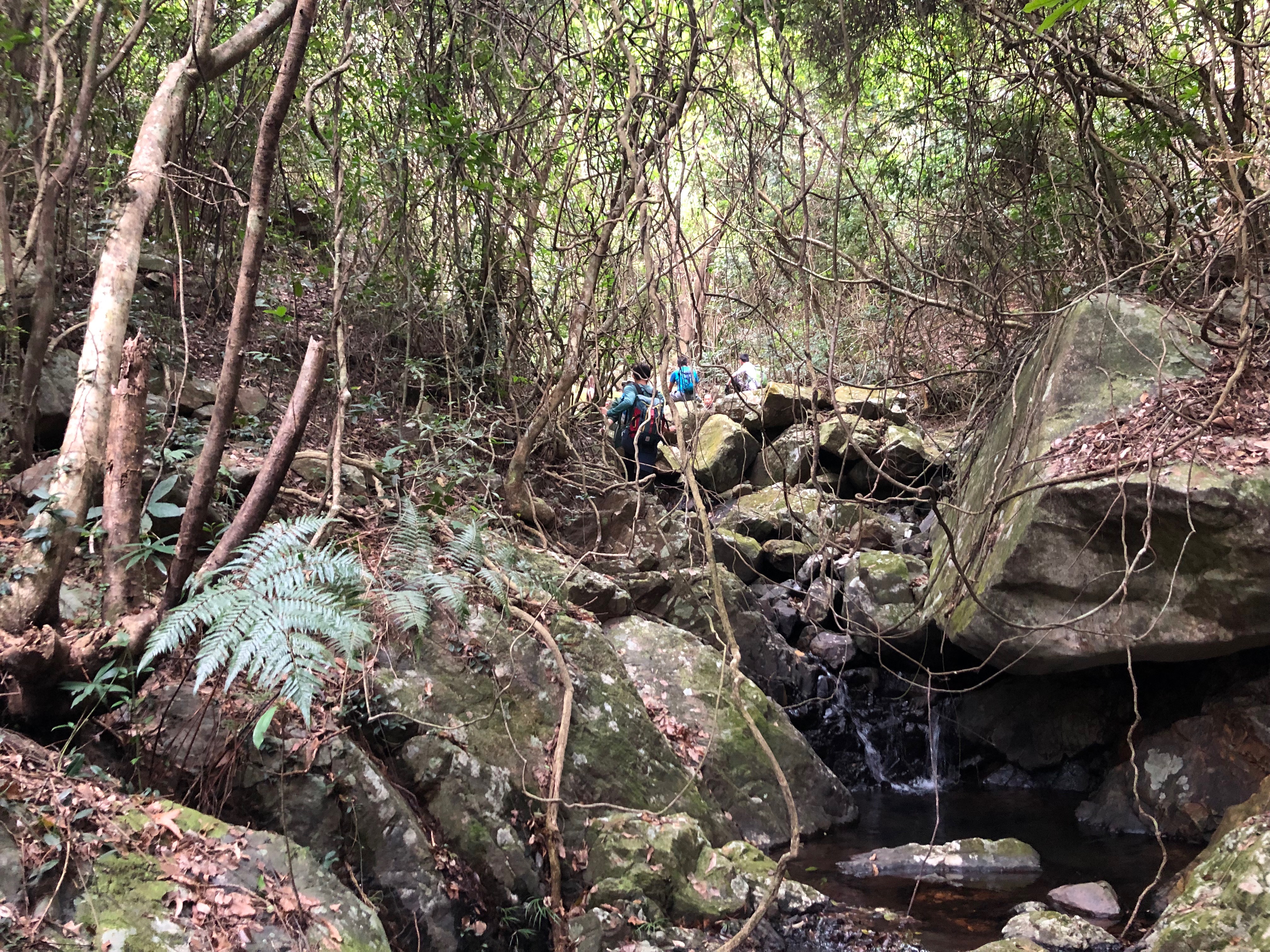 繼續上溯,先抵「靈象石河」,無數大石堆疊在山坡上,前行需要特別小心。早前可能受強颱風山竹影響,眼見不少大樹連根拔起,令原本明顯的山路都被截斷了。