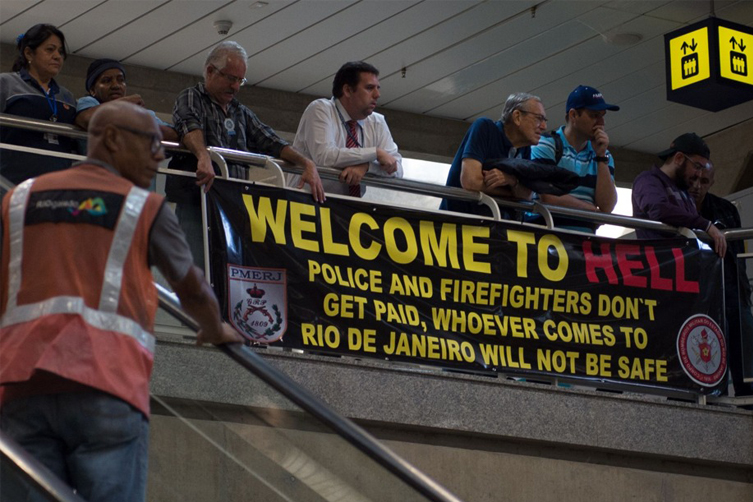 巴西第二大城里約熱內盧約300名警員示威抗議政府拖欠薪資,有人在機場高舉抗議布條,上面寫着「歡迎來到地獄,警察和消防員都沒有薪水,無論是誰來到里約,都不會安全。」報道指出,里約市財政結據,除了無法向警察支薪,更連警員基本的配備也未能提供,包括基本汽油和衛生用品,影印機沒有墨水。警方擔心奧運將帶來超過50萬國際旅客,設備不全可能造成危險。另外,政府財困亦牽連窮人的福利,里約為窮人而設的食堂因缺乏資金而關閉。