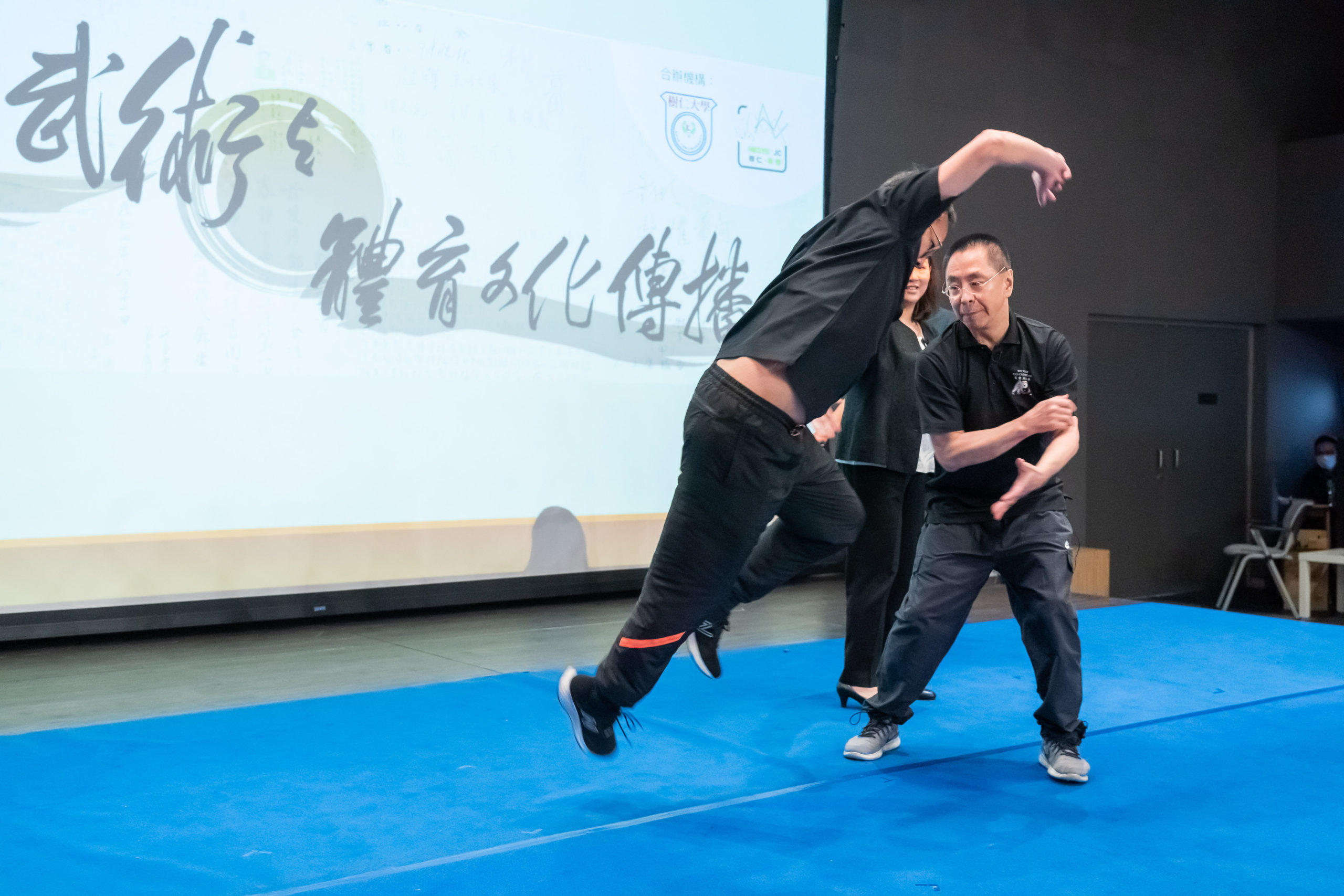 「中華武術與體育文化傳播」項目主理人、仁大新傳系系主任李家文博士(中排右七)、「中華武術與體育文化傳播」及「詠春的虛擬境界」等項目顧問彭耀鈞博士(右六)、吳式太極第五代掌門人吳光宇師傅(右八)與參加者合照(廖卓安攝)