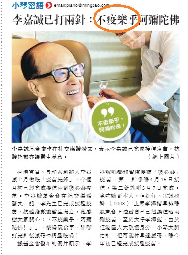 李嘉誠已打兩針:不疫樂乎阿彌陀佛