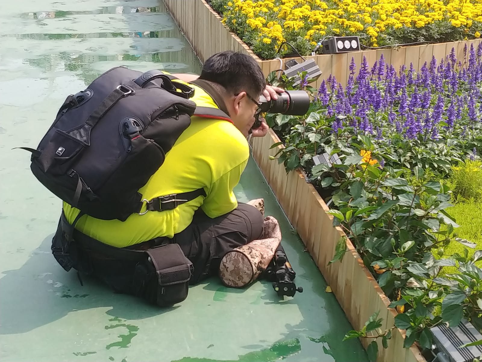 一名男子手持長鏡頭相機,不惜盤坐於稍濕的地上,嘗試以最佳角度拍攝花卉。