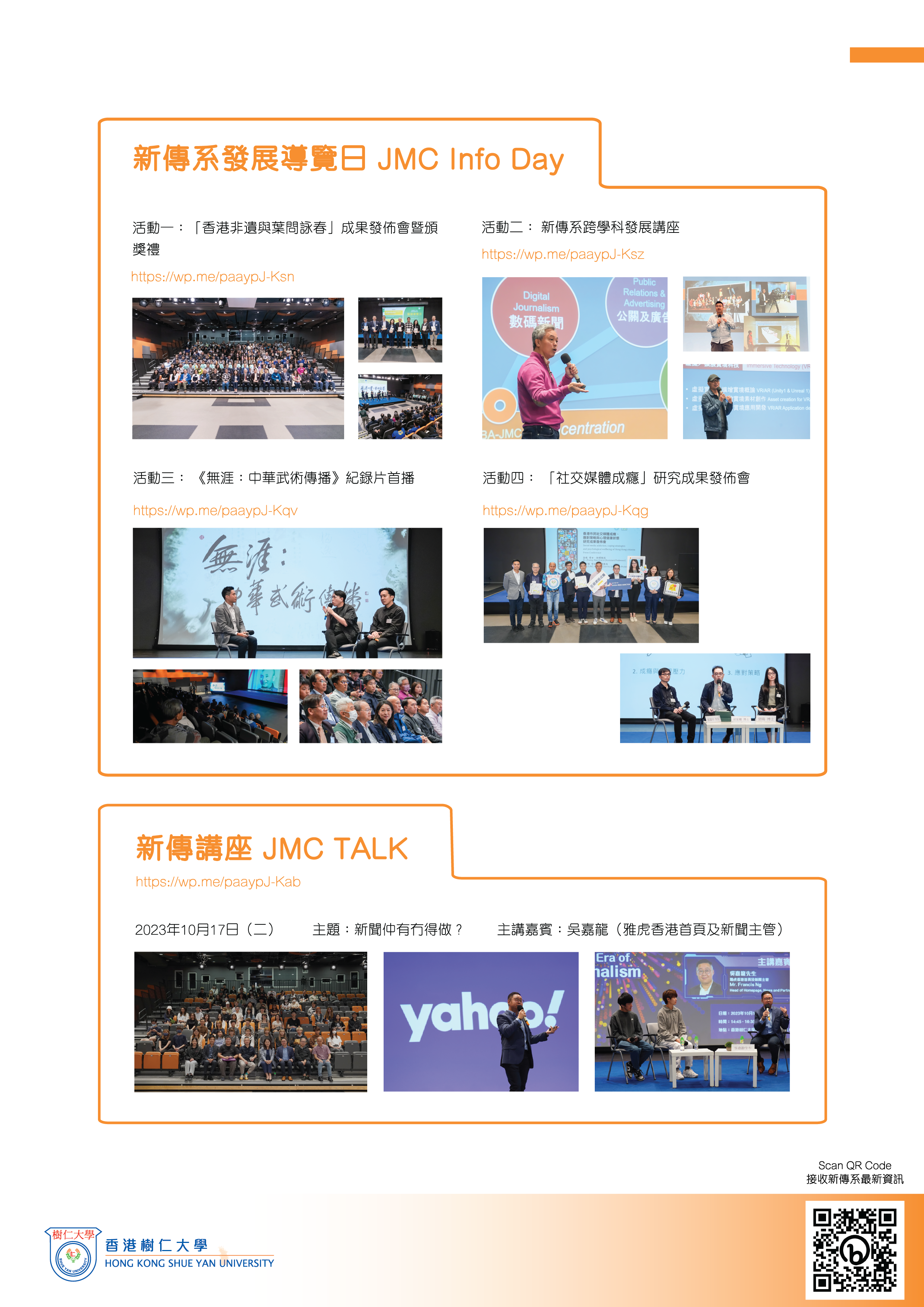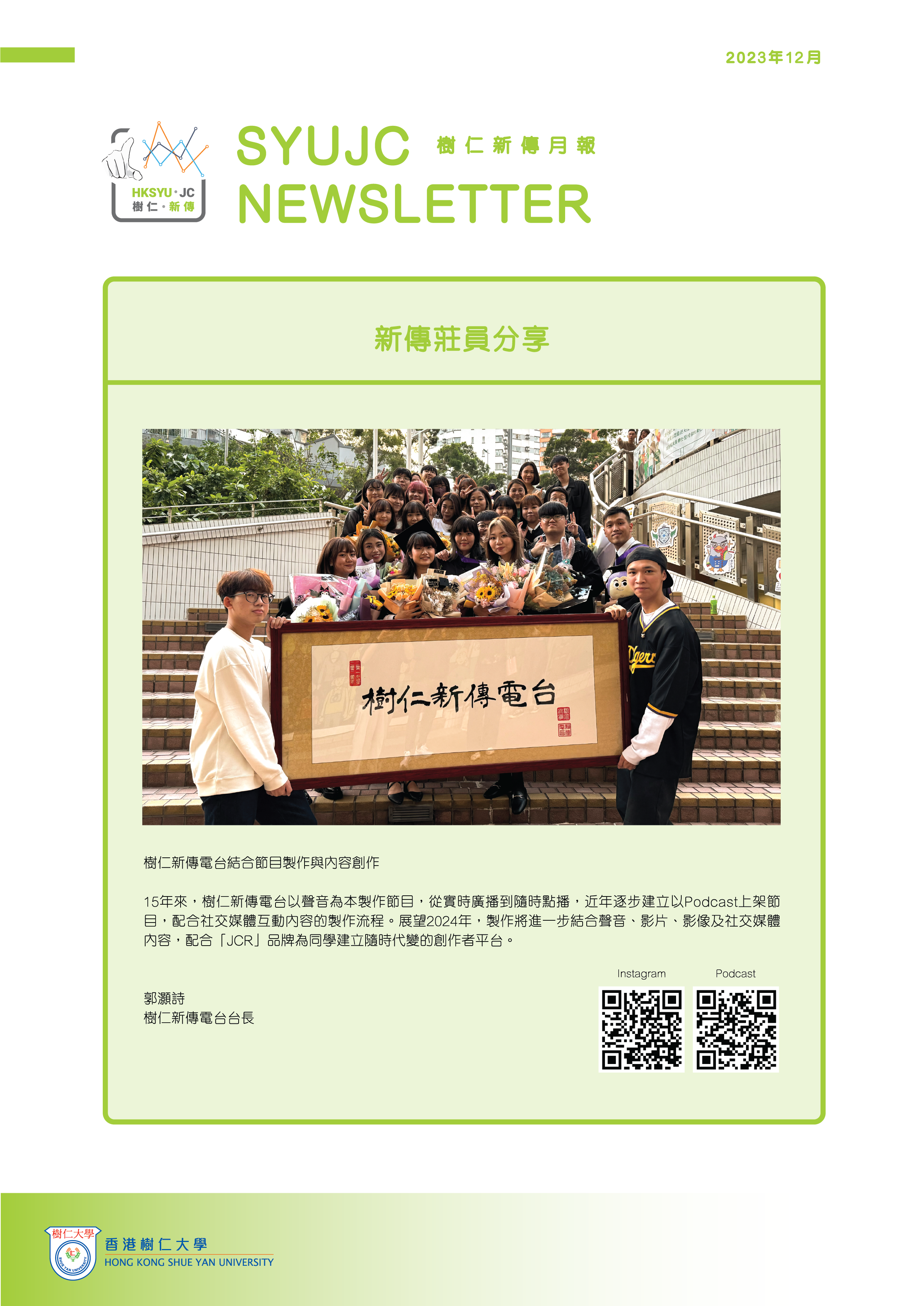 校園活動樹仁新傳月報編輯推介 【樹仁新傳月報】2023年12月號 December 16, 202304198 香港樹仁大學新聞與傳播學系刊出《樹仁新傳月報》十二月號,校內實習組織之一的「樹仁新傳電台」台長郭灝詩表示,2024年製作將進一步結合聲音、影片、影像及社交媒體內容,配合「JCR」品牌為同學建立隨時代變的創作者平台。 《樹仁新傳月報》十二月號,第一頁。 《樹仁新傳月報》十二月號,第二頁。 Related Related tags : 吳嘉龍樹仁新傳月報樹仁新傳電台郭灝詩 港交所委任聯席營運總監陳翊庭明年5月接替歐冠昇出任行政總裁 Previous Post 習近平:中央對李家超和特區政府的工作充分肯定 Next Post