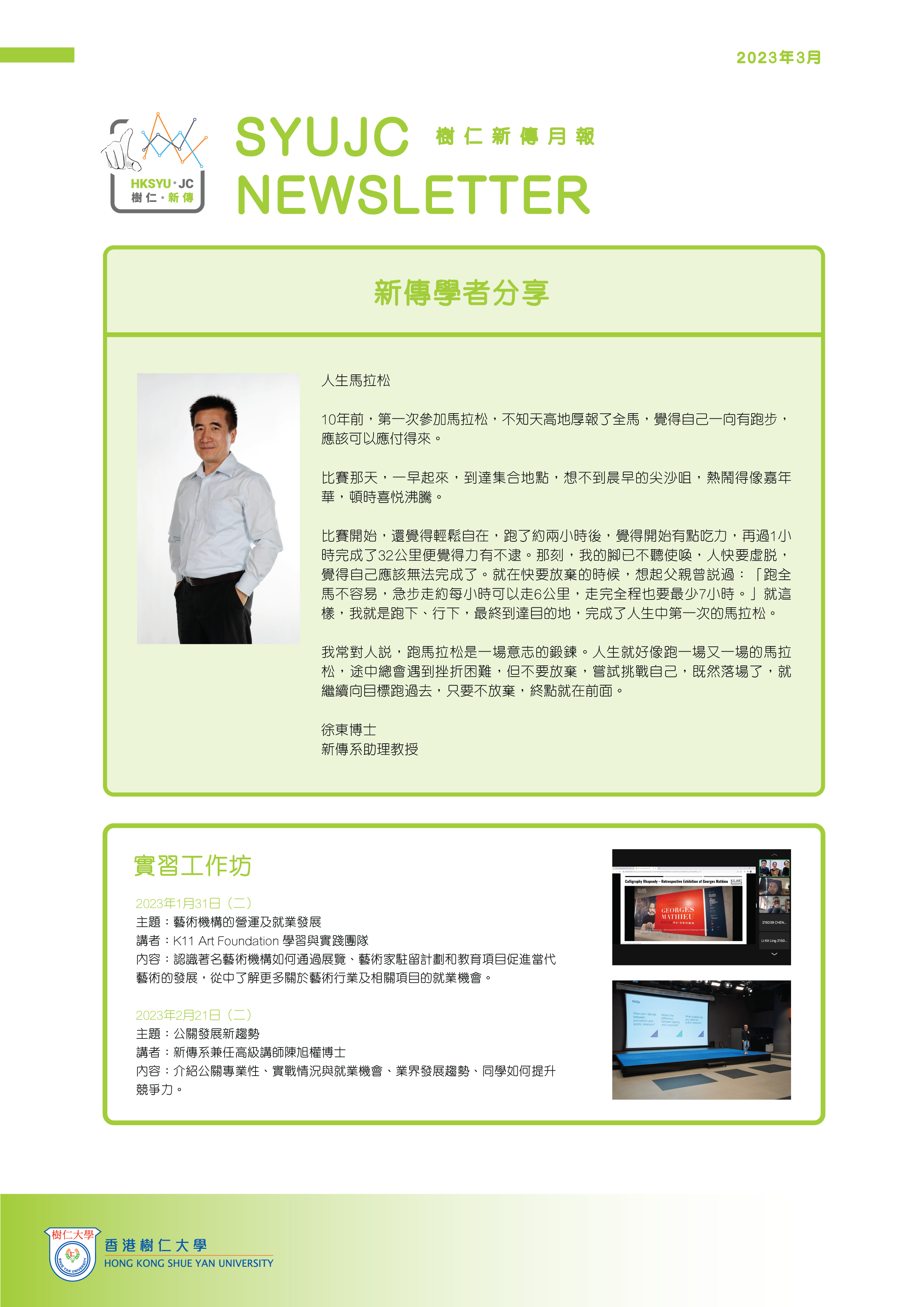 校園活動樹仁新傳月報編輯推介 【樹仁新傳月報】2023年3月號 March 25, 202301263 香港樹仁大學新聞與傳播學系刊出《樹仁新傳月報》三月號,新傳系助理教授徐東博士分享十年前首次參加「全馬」賽事。他表示,跑馬拉松是一場意志的鍛鍊,人生就好像跑一場又一場的馬拉松,途中總會遇到挫折困難,但不要放棄,嘗試挑戰自己,既然已落場就繼續向目標跑過去,只要不放棄,終點就在前面。 《樹仁新傳月報》三月號,第一頁。 《樹仁新傳月報》三月號,第二頁。 Related Related tags : 徐東李家文李文樹仁新傳月報羅燦蘇啟智蘇鑰機陳旭權 政府指交椅洲人工島水平以上高度平均有7.5米 符合國際標準 Previous Post 【公關入門】曾立基:講求思維和態度 Next Post