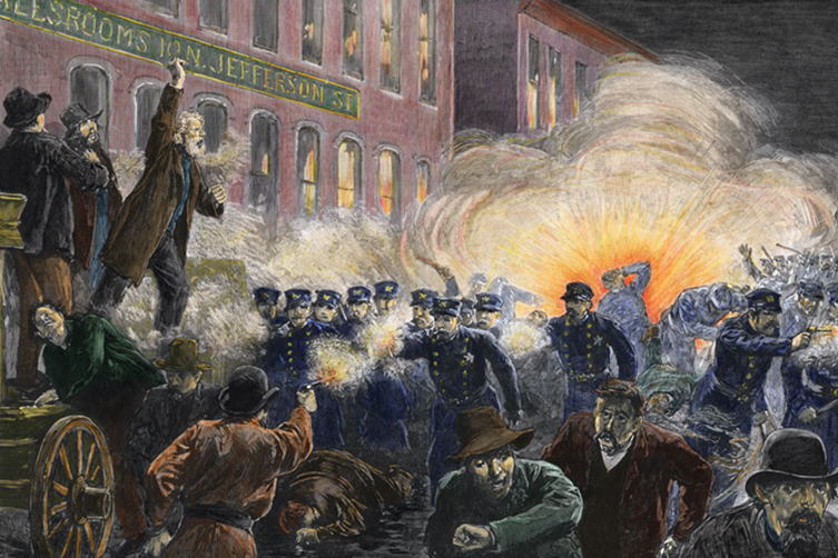 5月3日,示威中心點的芝加哥政府出動警察示威民眾進行鎮壓,向人群開槍,打死了2人,事件進一步升溫。5月4日,罷工工人在乾草市場廣場抗議警察的暴力鎮壓。現場約2,500名勞工雖情緒激昂,過程卻非常和平。不過,正當示威者退場時,一隊180名全副武裝的警察突然到來,將現場包圍起來,命令他們馬上解散。