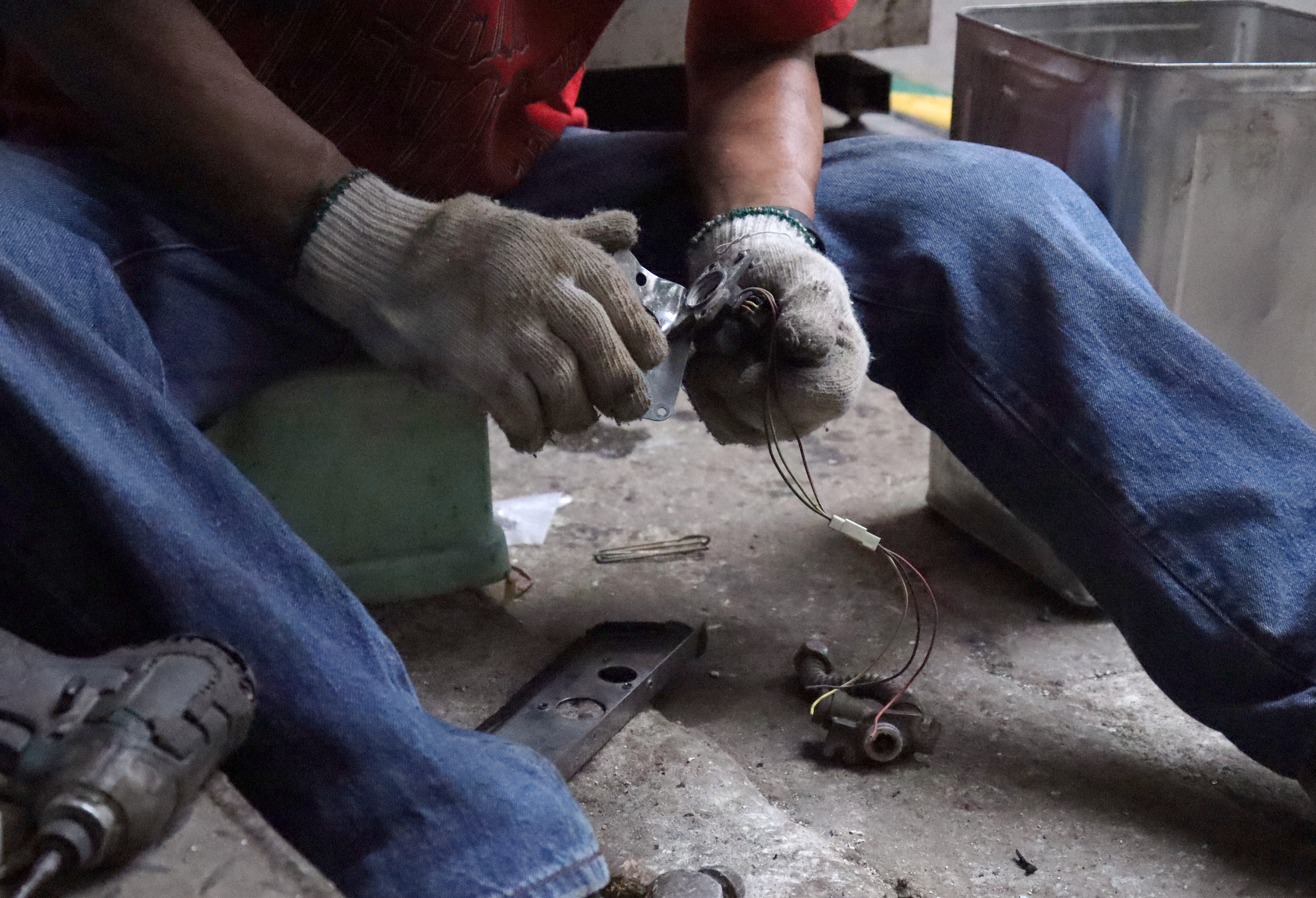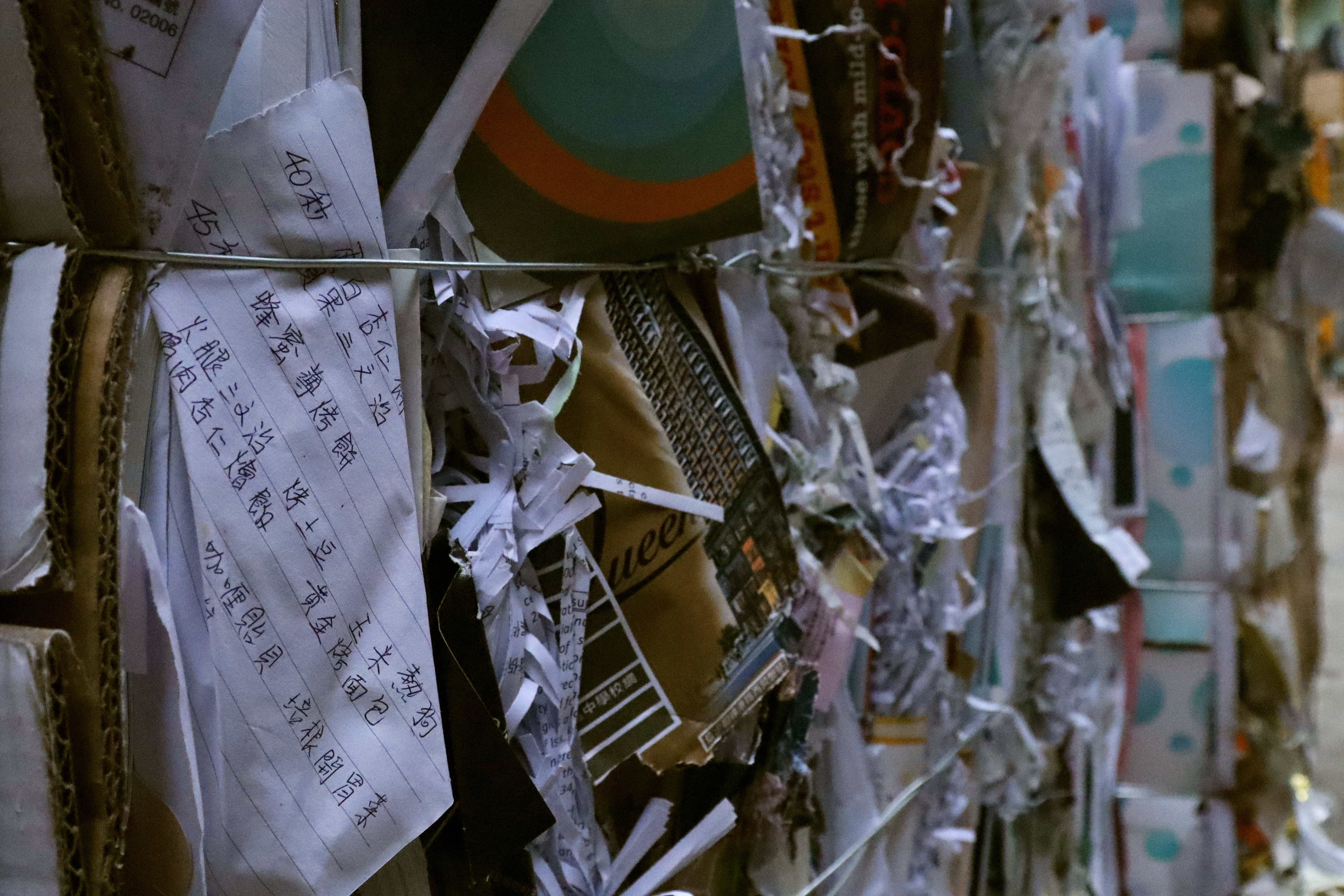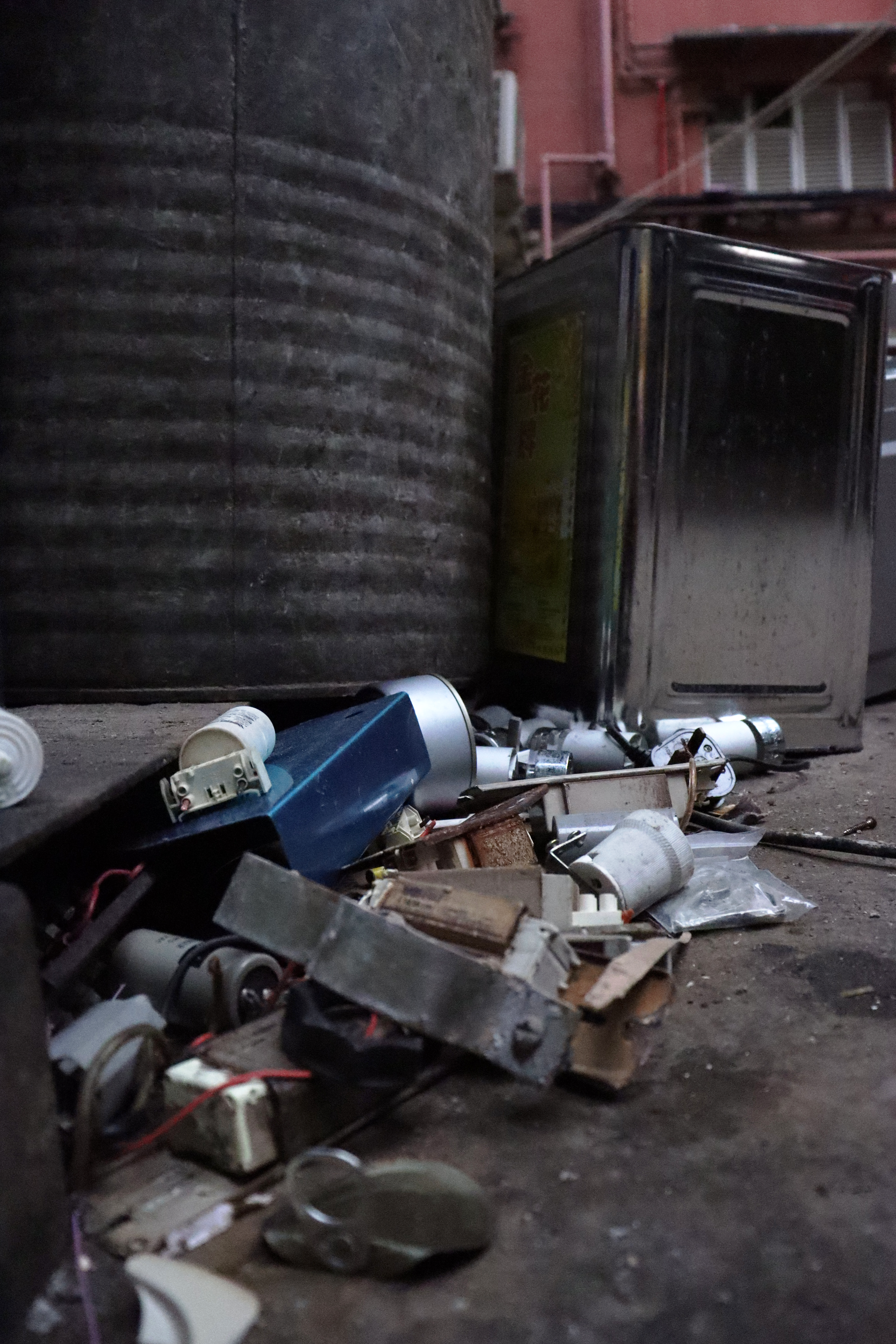 老闆娘、明哥和阿梅(同音)是合記五金的核心人物。老闆娘處事爽快但相對冷漠,她雖大方答應讓我在店內進行拍攝,但每當我追問一些有關店舖的狀況時,她都會選擇繼續專注地纏包用於處理紙磚的鐵線,拒絕回應問題,容易讓不熟悉她的人感到疑惑。明哥則包辦拆冷氣機和兌換現金的工作,是店裏最平易近人的一位。至於阿梅的工作以拆電風扇為主,雖然她做事看似不拘小節丶雜亂無章,其實只是她做事有自己的模式和風格,對工作還是遊刃有餘的。除了以上的工作,合記還要每天把回收到的廢紙壓成大紙磚,連同其他拆卸好的回收物品及分類好的零件,在下午五時前送至柴灣碼頭,再運送到加工廠,將不再被需要的,變成熱能或電能,以助社會運作。