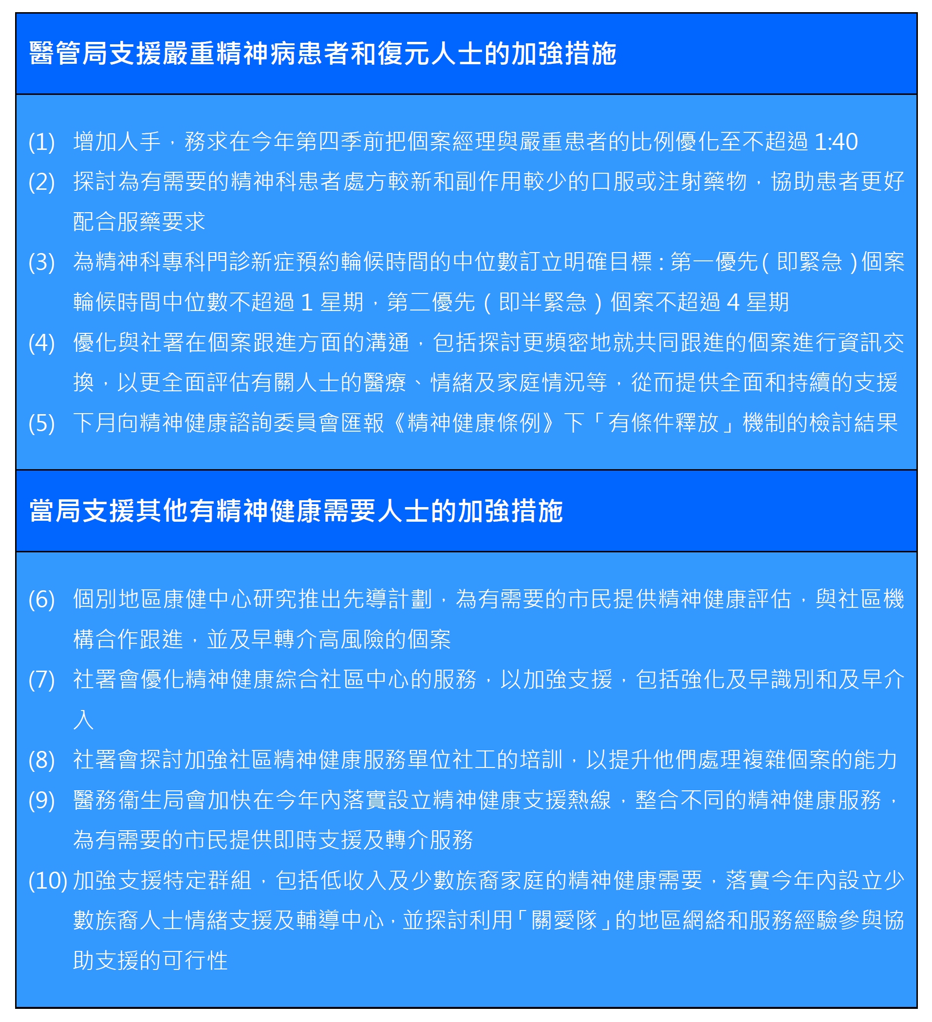 政府公布10項措施,加強對嚴重精神病患者和復元者的支援,以及加強識別有精神健康需要人士並提供支援。