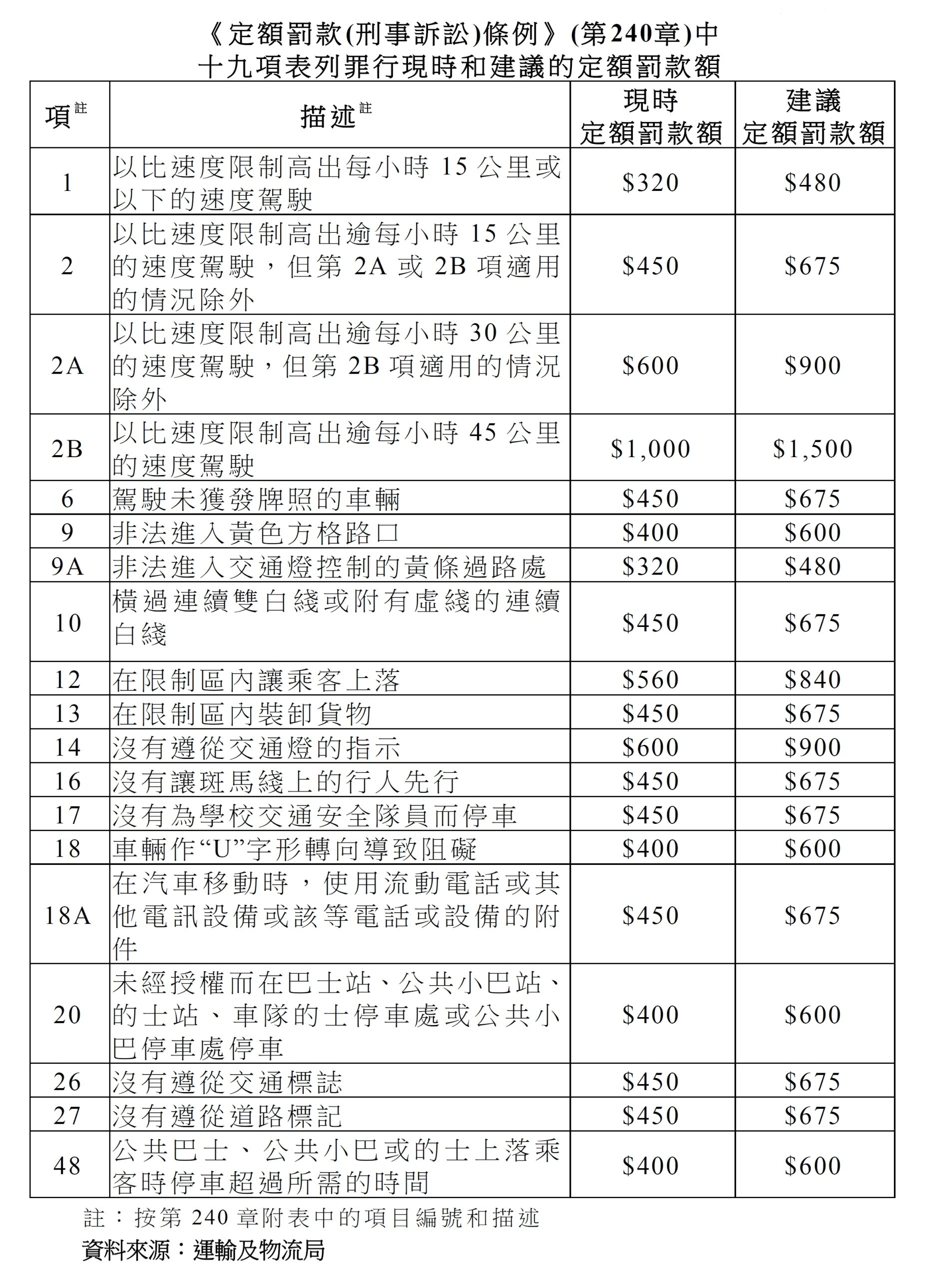 運物局發言人說,為加強保障交通安全和交通暢順,政府建議違例泊車的定額罰款額由現時320元,調高至400元,即上調25%。其他與道路安全和交通擠塞相關的19項違例事項的定額罰款額(見下表),將由現時的320元至1,000元不等,調高至480元至1,500元不等,上調幅度為50%。其他交通罪行的罰款額則維持不變。