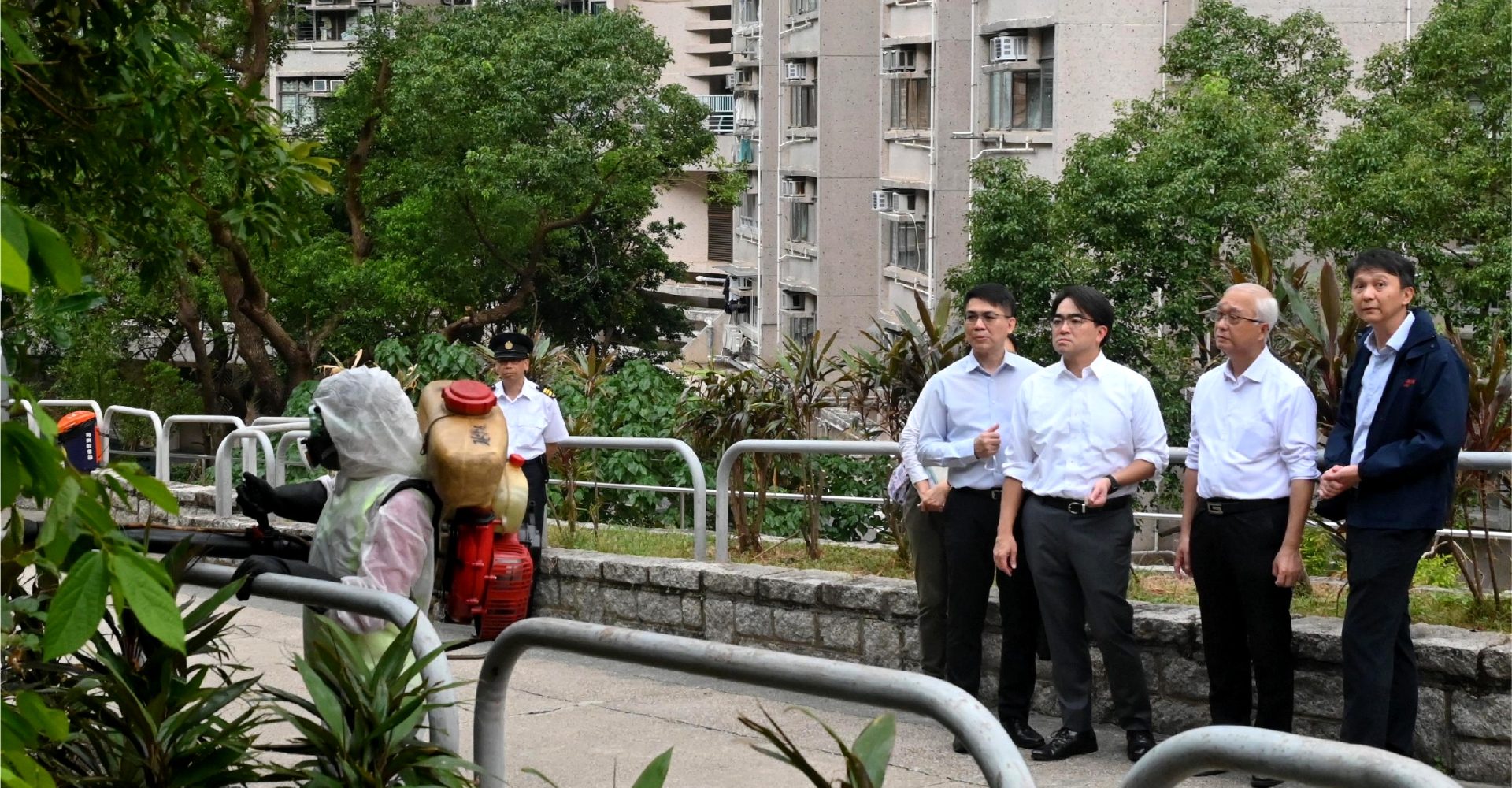 主圖片:環境及生態局局長謝展寰(右2)今午在食物環境衞生署署長吳文傑(右3)和助理署長(行動)蔡家偉(右4)陪同下於黃大仙鳳德邨視察加強防蚊滅蚊等工作。