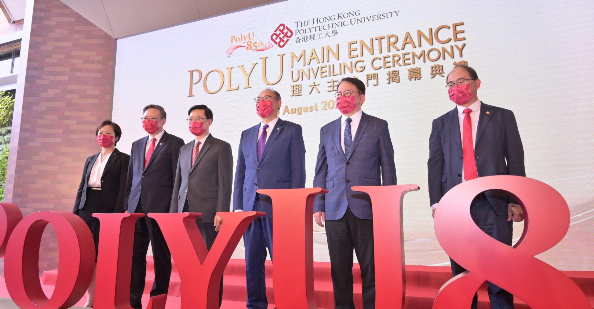 封面圖片:(左起)理大行政副校長盧麗華、理大校長滕錦光、行政長官李家超、理大校董會主席林大輝、政務司司長陳國基和理大常務及學務副校長黃永德出席揭幕典禮。