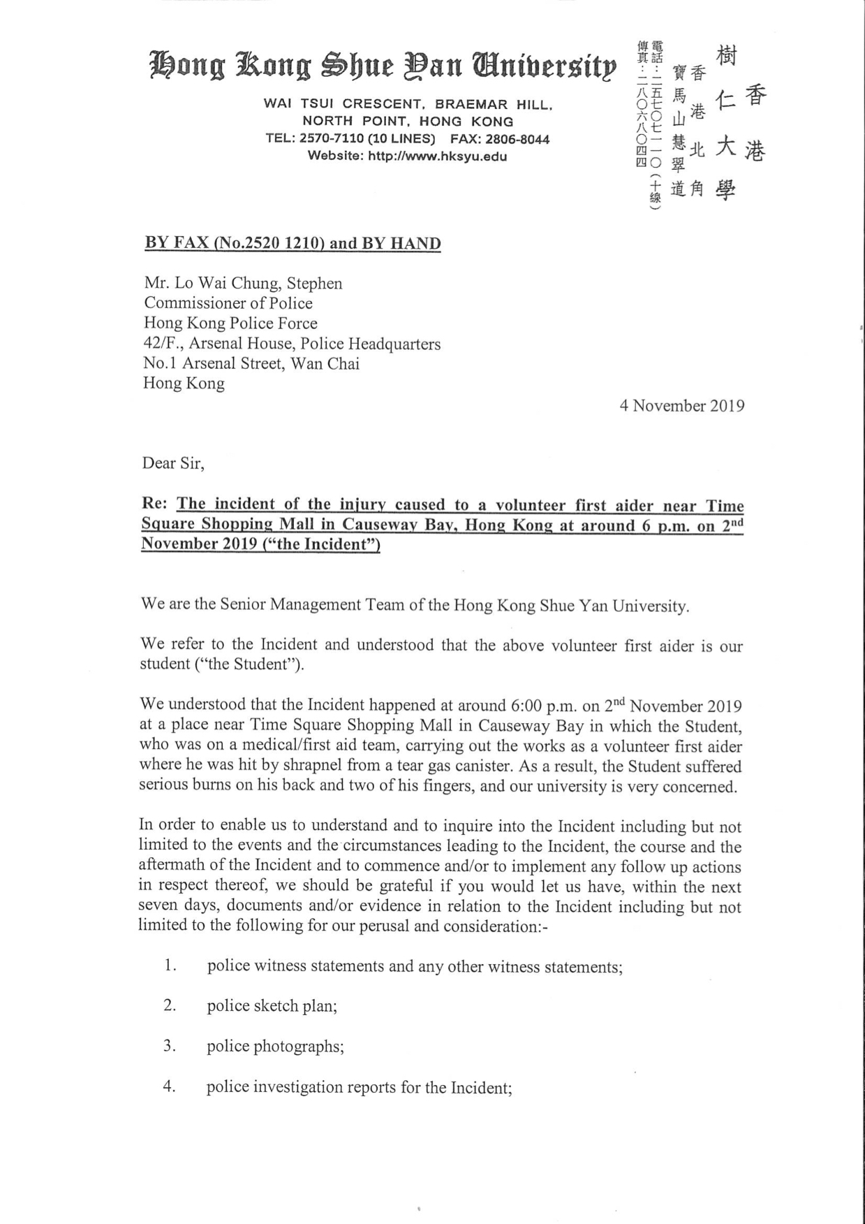 樹仁大學常務副校監胡懷中發電郵給全體師生,指校方已就校內一名學生,周末在港島區的公眾活動中,懷疑遭催淚煙彈擊中燒傷事件,去信警務處處長,促請處方在七日內提供有關資料,以作進一步跟進。