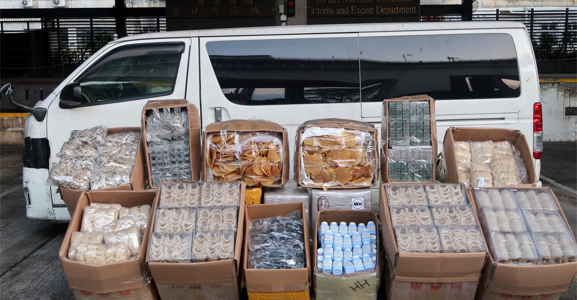 主圖片:海關展示部分檢獲的懷疑走私物品,及被扣查的懷疑涉案輕型客貨車。