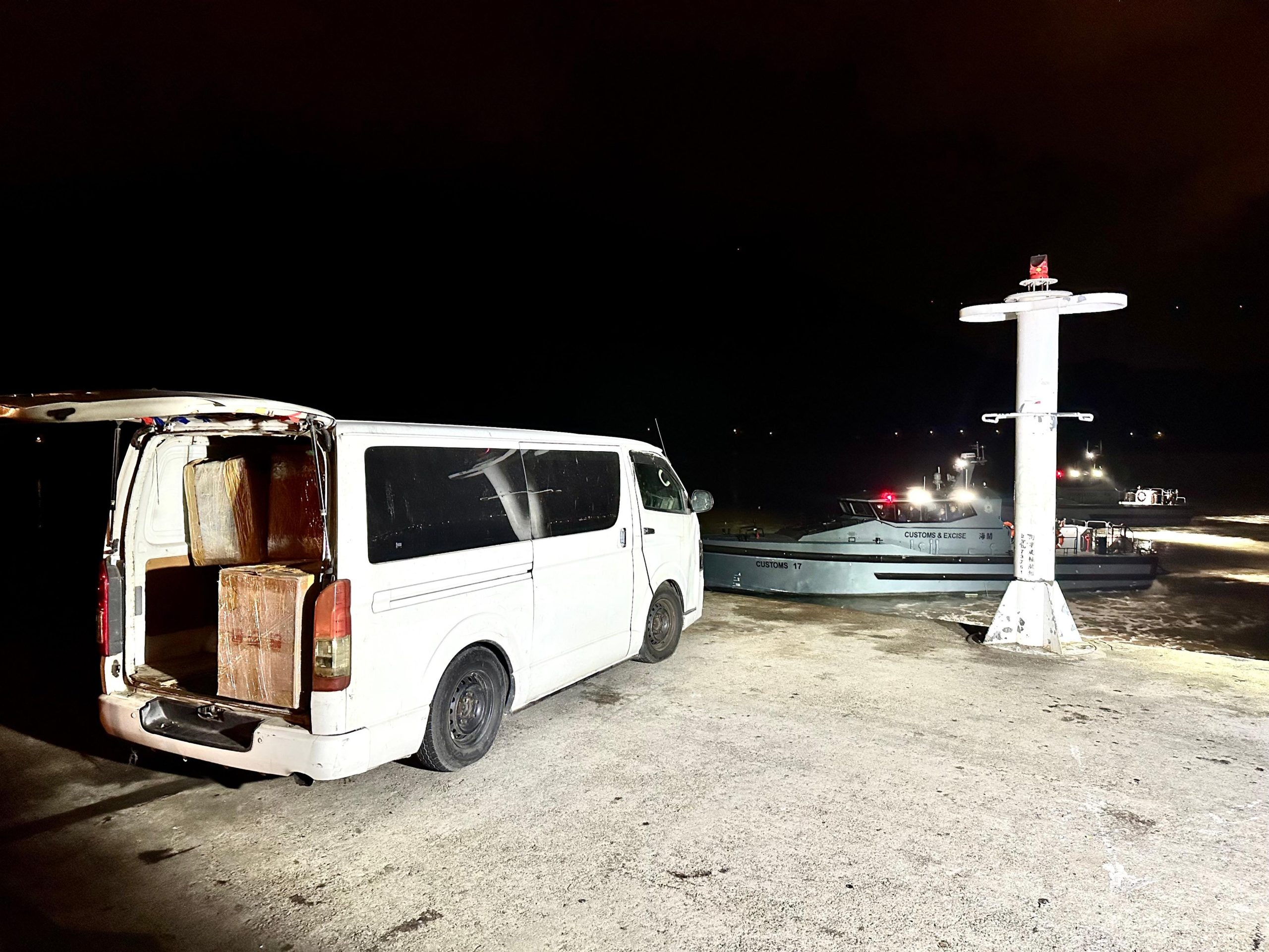 海關昨日(24日)凌晨在東涌附近水域進行反走私行動時,發現一艘沒有開啓航行燈的可疑快艇,駛向東涌公眾碼頭。其後,一輛輕型客貨車到達碼頭,貨車男司機和7名男子隨即將貨車上的貨物搬上快艇。海關人員隨即採取行動,該8名男子迅速登上快艇並高速駛向內地水域逃去。