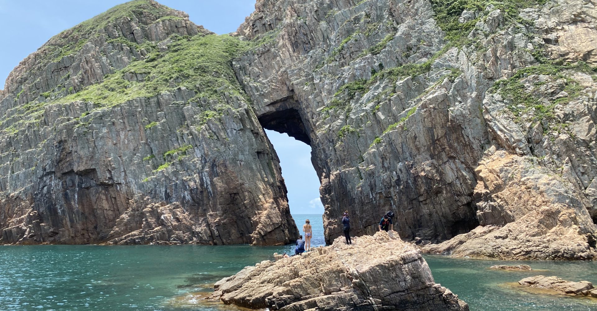 到達火石洲,先去東南面的海蝕拱「關刀洞」,屬香港水域「東海四大名洞」之一。