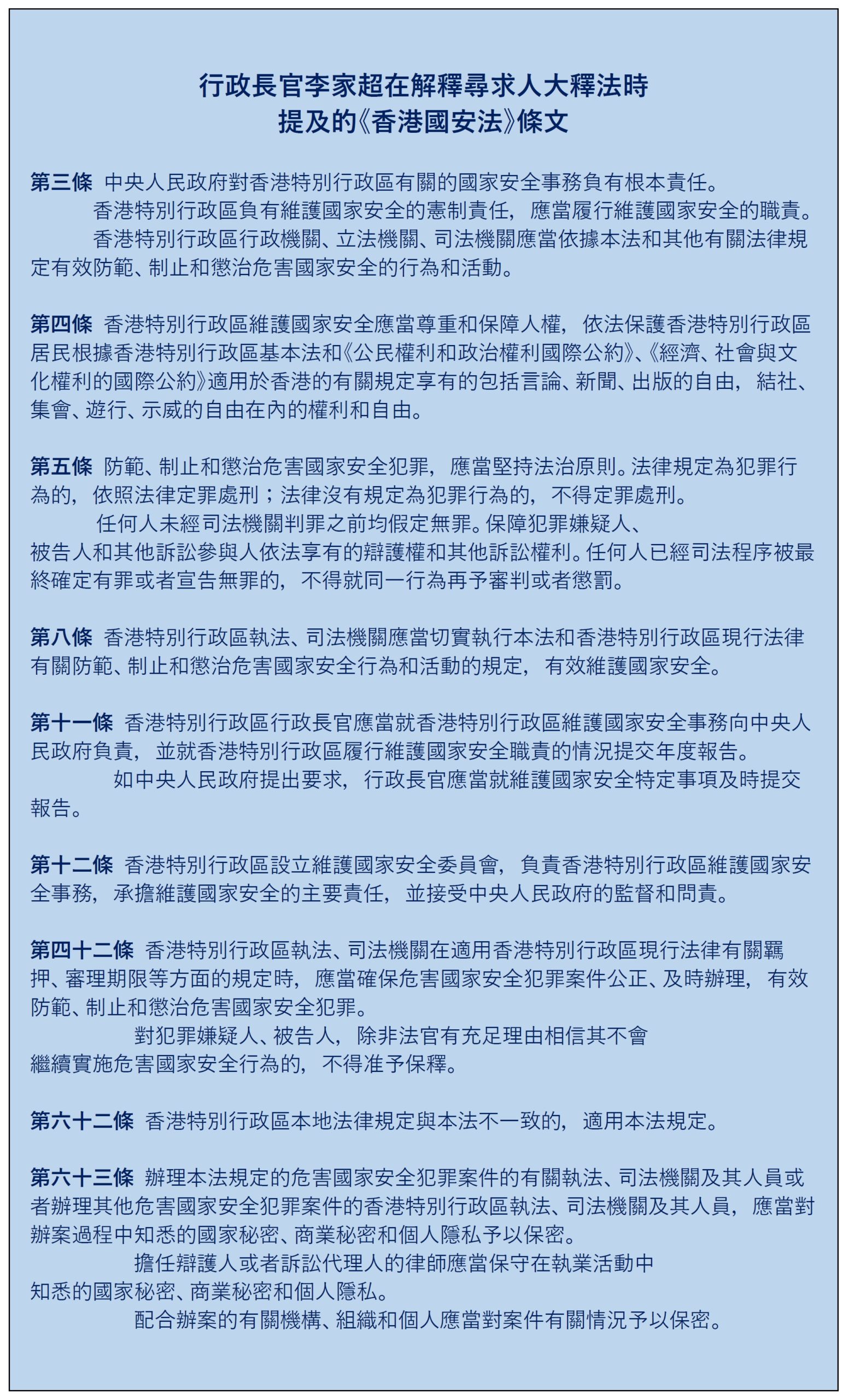 更正:在「行政長官李家超在解釋尋求人大釋法時提及的《香港國安法》條文」的表中, 《香港國安法》 第三條本應有3個段落,但首次發表時遺漏了第二和第三段,現已補上。(2022年12月31日)