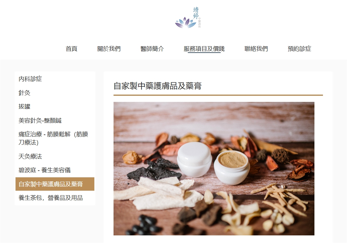 註冊中醫陳靖婷創辦的「靖婷中醫診所」網站展示自家製中藥護膚品及藥膏。
