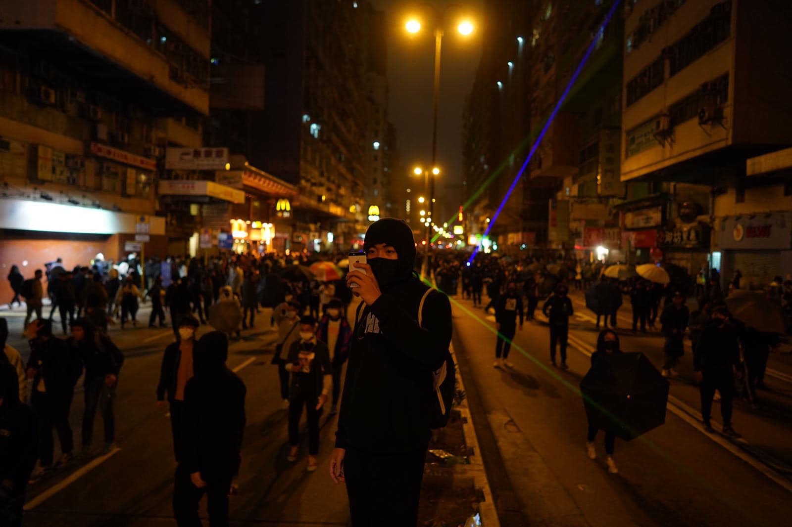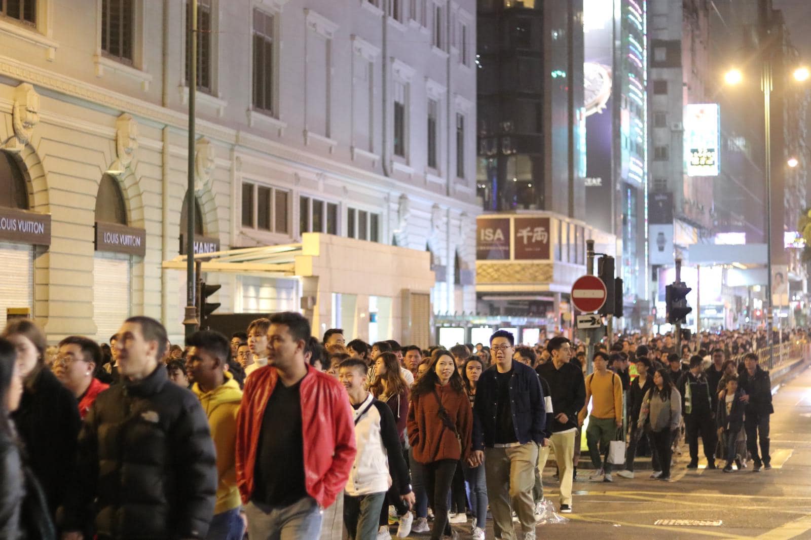 尖沙咀鐘樓附近有市民自發組成隊伍,沿海旁遊行,有人高舉「光復香港時代革命」旗及叫口號。