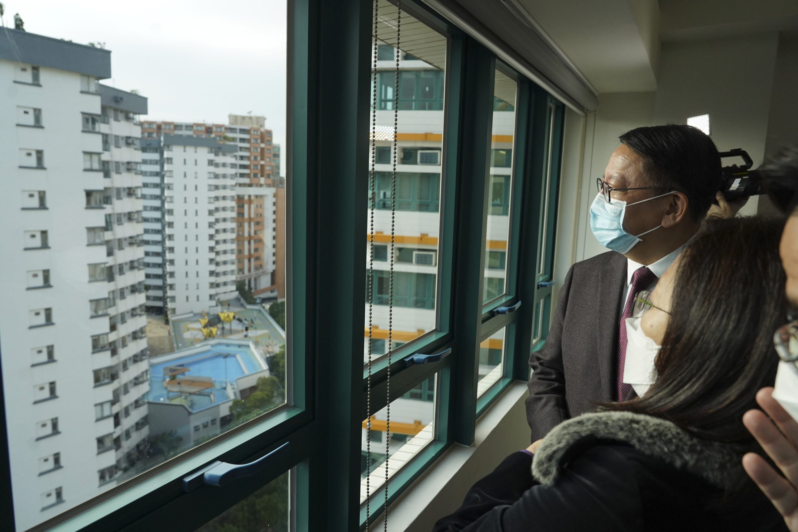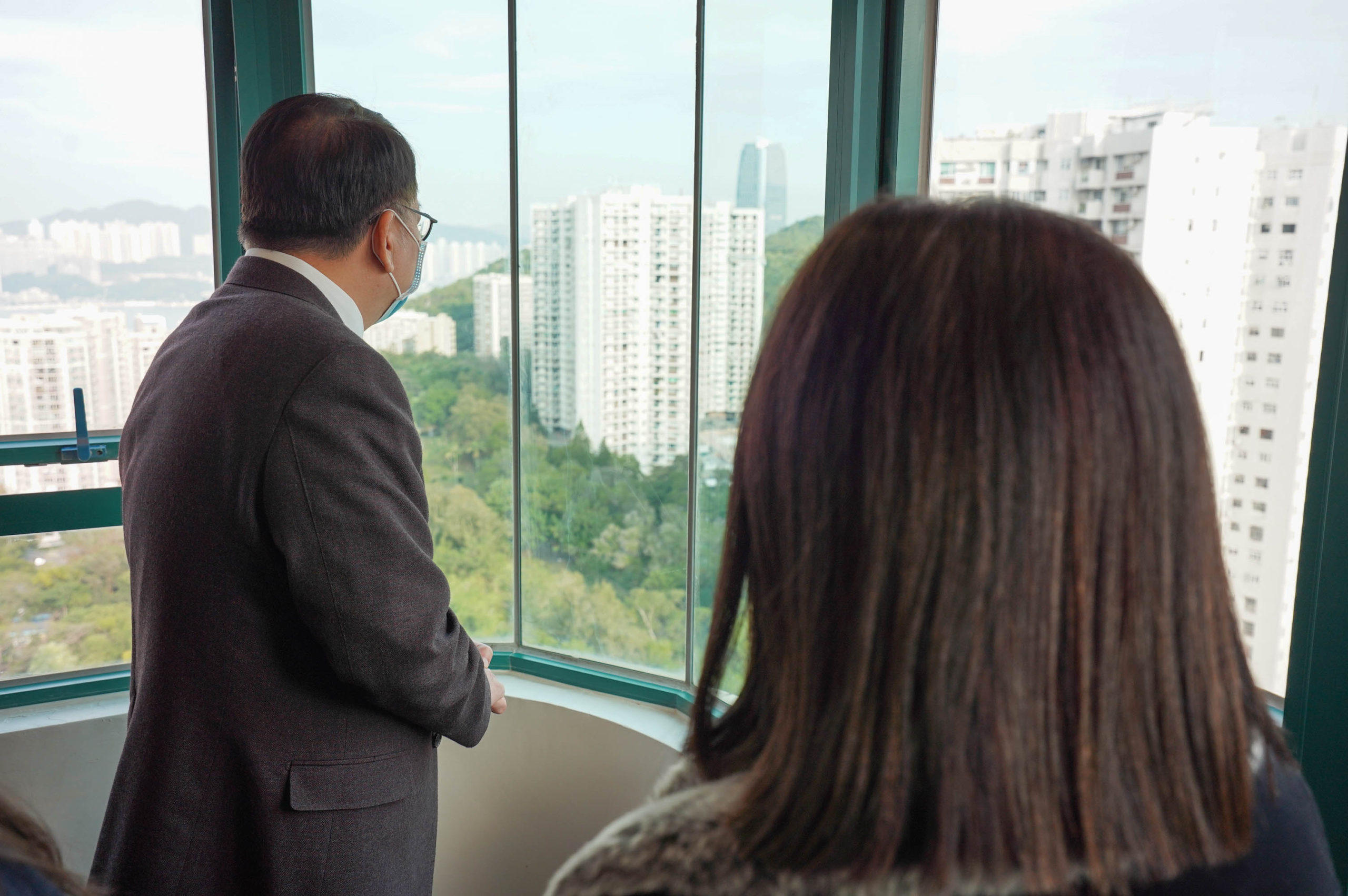 政務司司長陳國基遠眺仁大學生宿舍的港島東景色