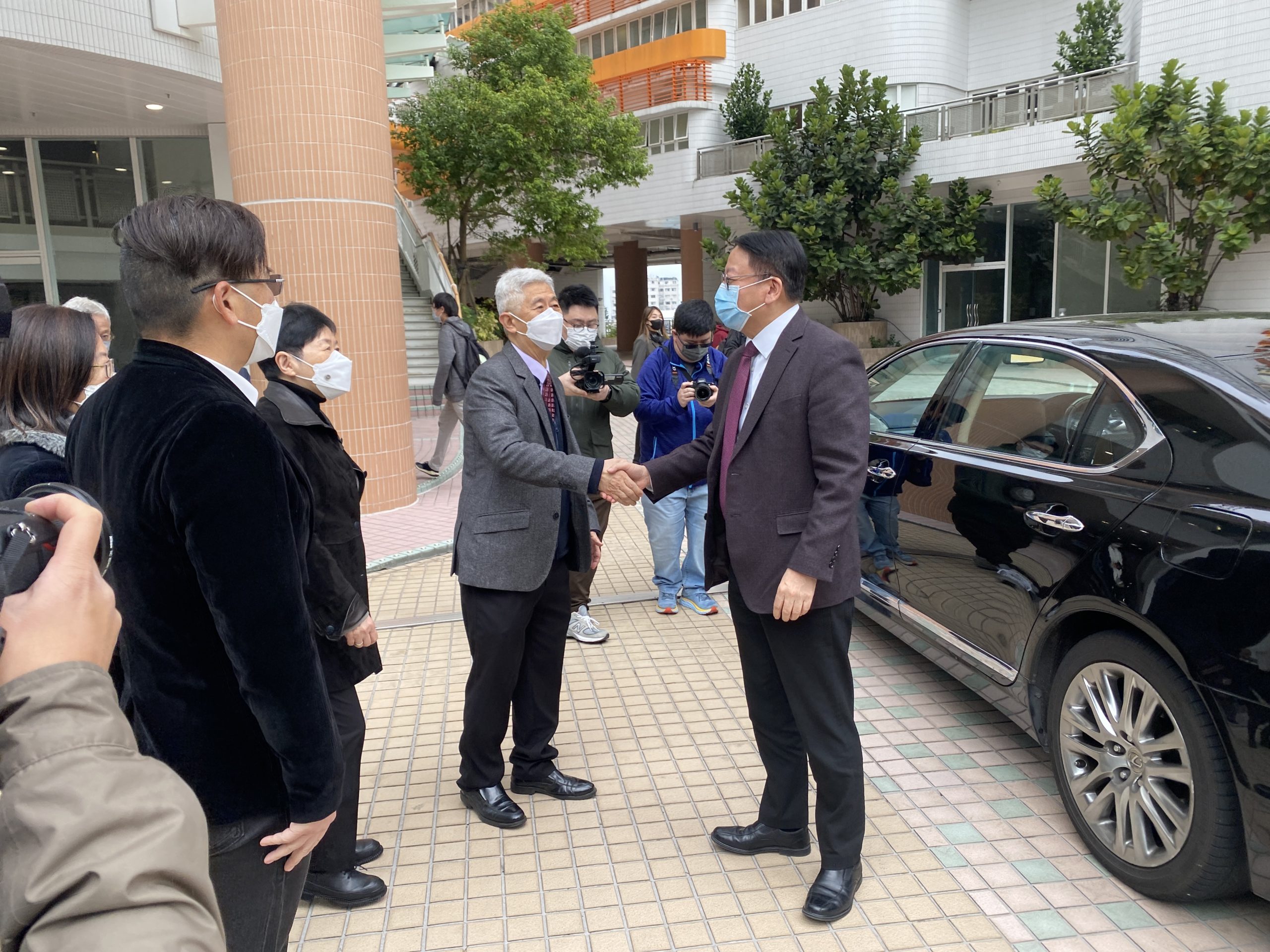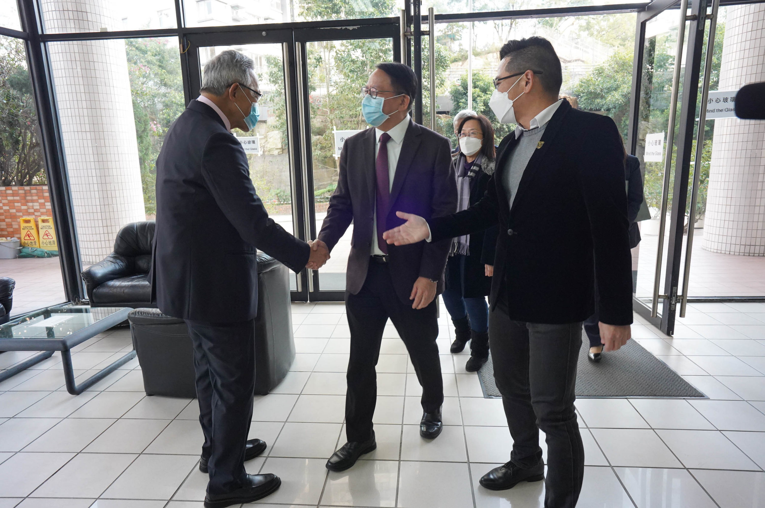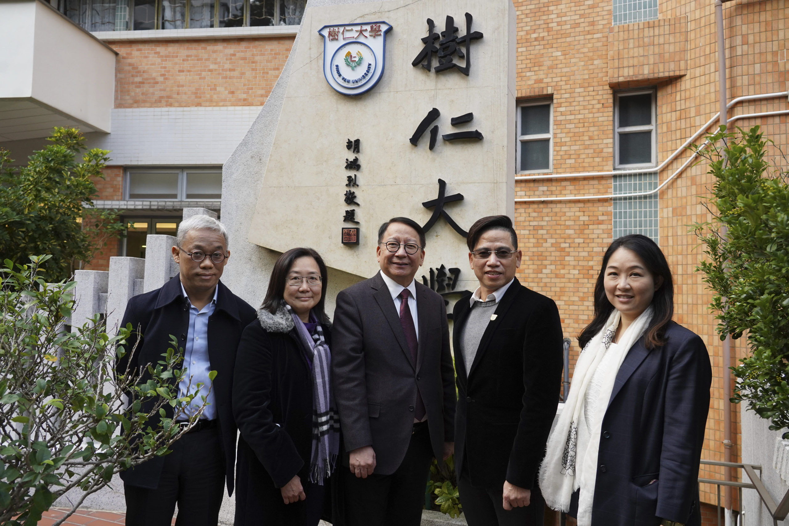 仁大常務副校監胡懷中博士(右二)與仁大管理層成員迎接政務司司長陳國基(右一)。