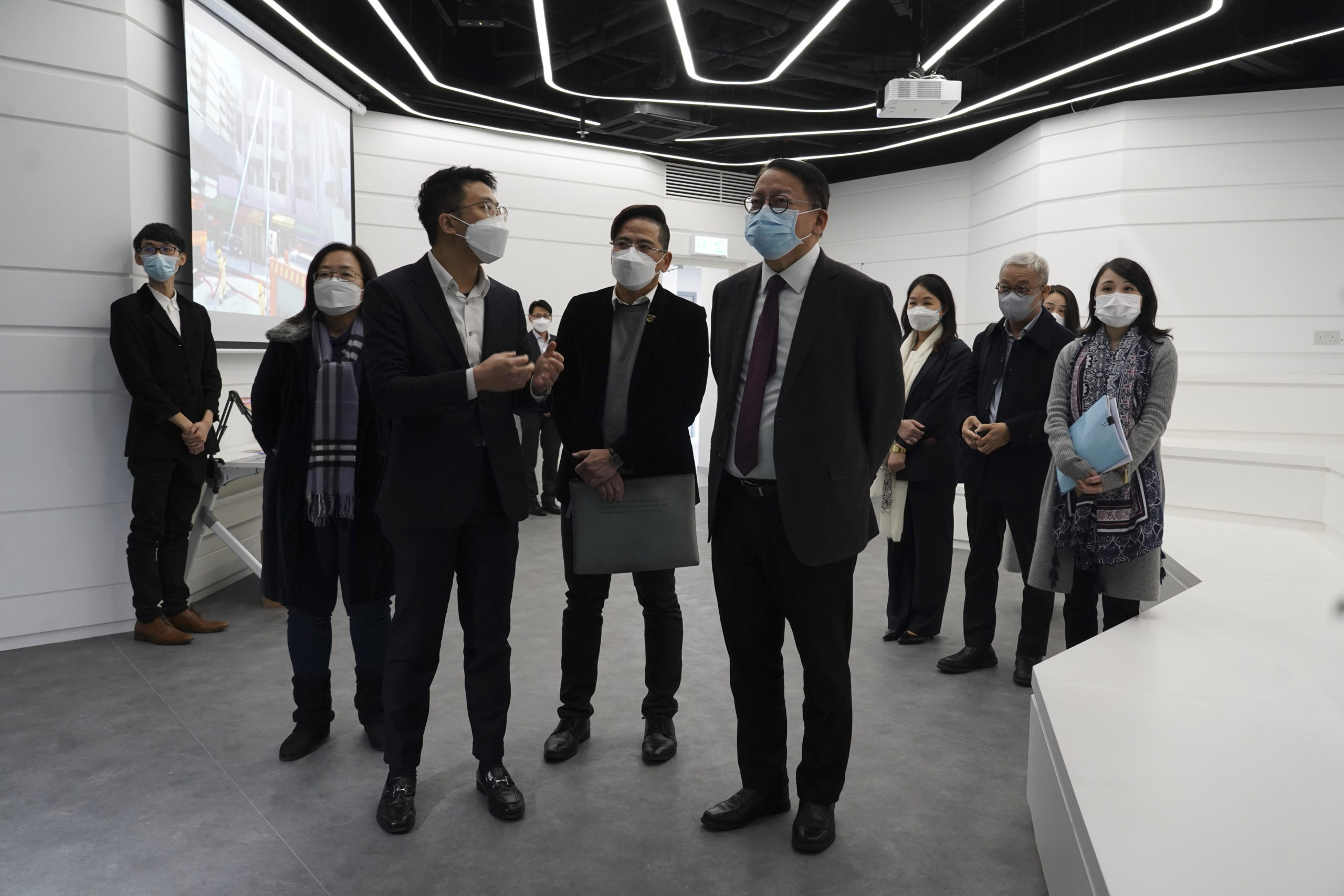政務司司長陳國基(前排右一)參觀虛擬實境實驗室。(前排左一起)仁大協理副校長(學生事務)葉秀燕、仁大助理學術副校長(教學發展)周德生博士、仁大行政副校長張少強教授。
