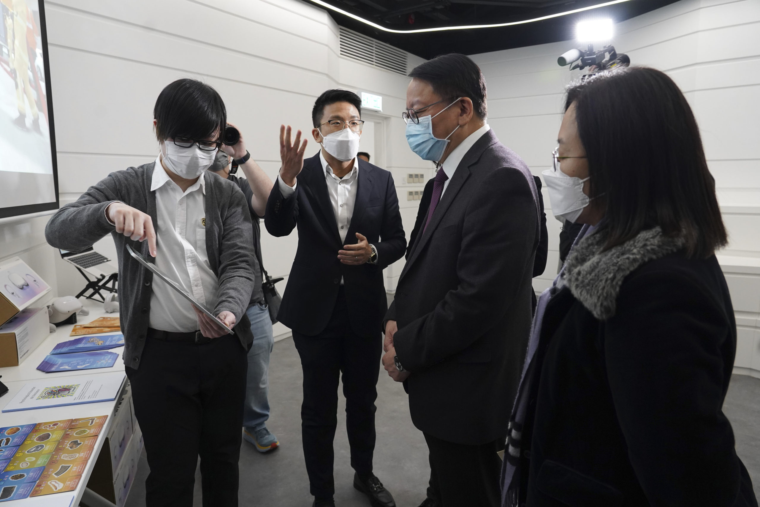 仁大助理學術副校長(教學發展)周德生博士(左二)向政務司司長陳國基(右二)講解仁大的擴增實境(AR)等相關科技項目。
