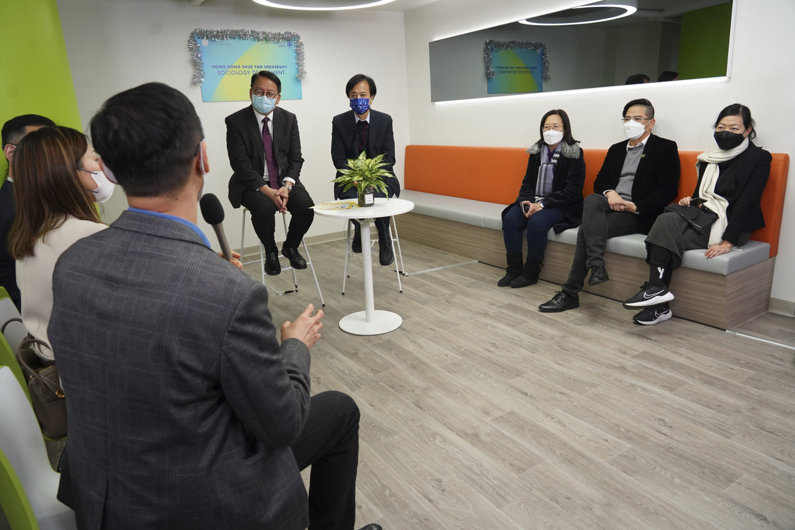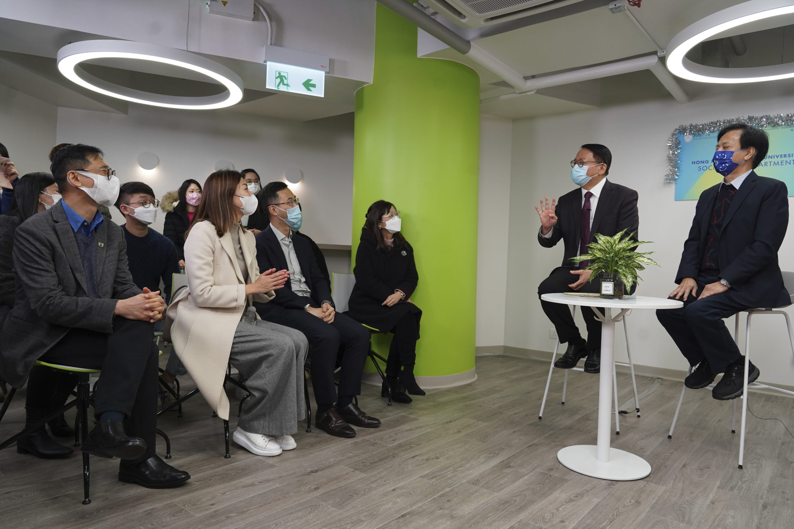 仁大社會學系畢業生、政務司司長陳國基(右二)與仁大社會學系系主任、卓越教授張越華博士(右一)跟仁大社會學系師生交流。