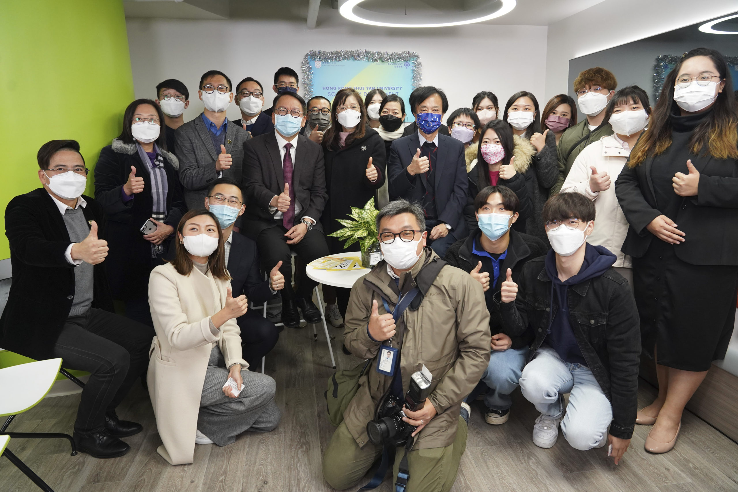 政務司司長陳國基(左三)在仁大學生宿舍與仁大行政副校長張少強教授(左四)、仁大協理副校長(學生事務)葉秀燕(右三)及其他宿生合照。