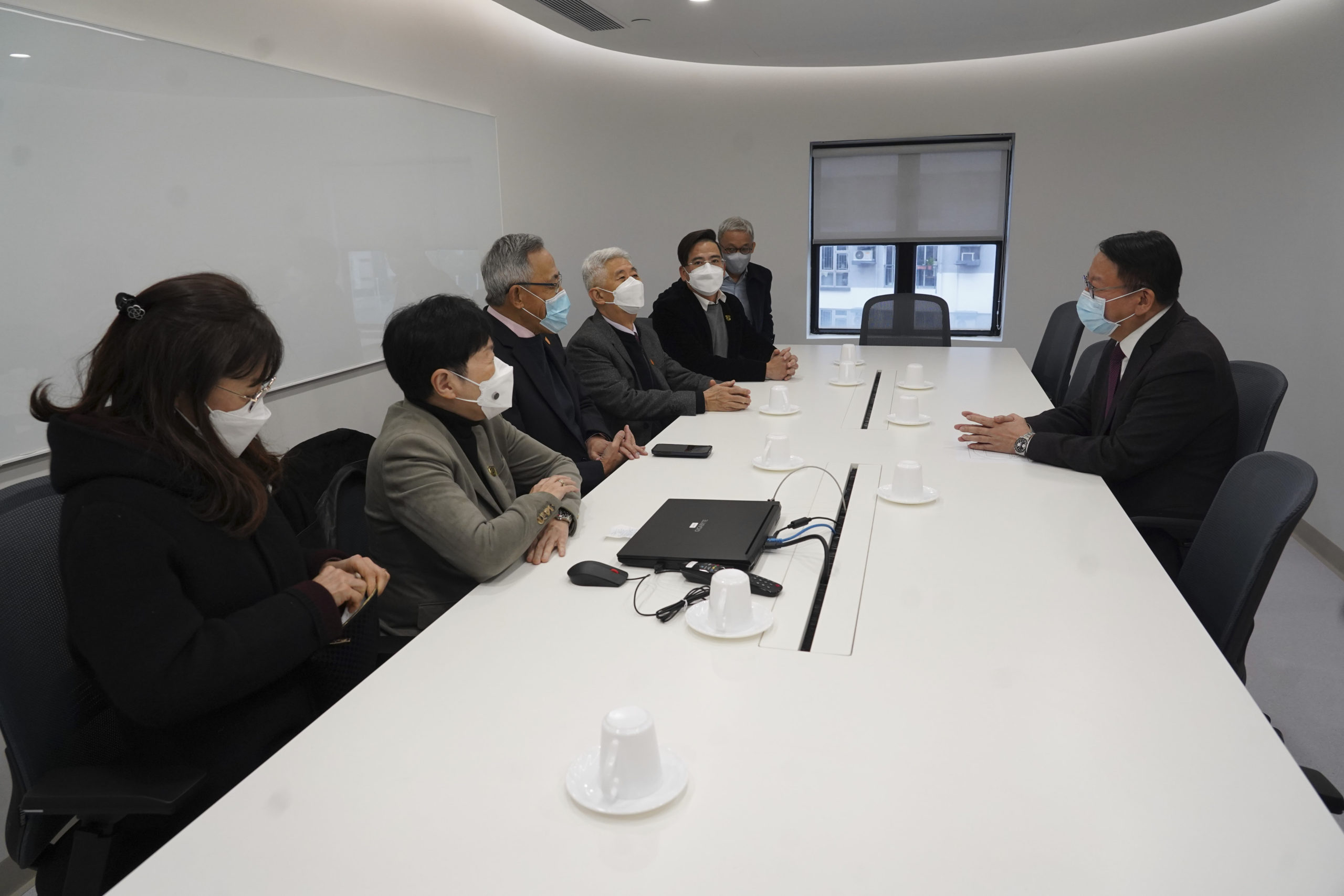 政務司司長陳國基(右)與仁大管理層成員交流。(左起)仁大學術副校長陳蒨教授、仁大首席副校長孫天倫教授、仁大校董會主席丁午壽、仁大常務副校監胡懷中博士、仁大行政副校長張少強教授、仁大新傳系兼任講師陳旭權博士。