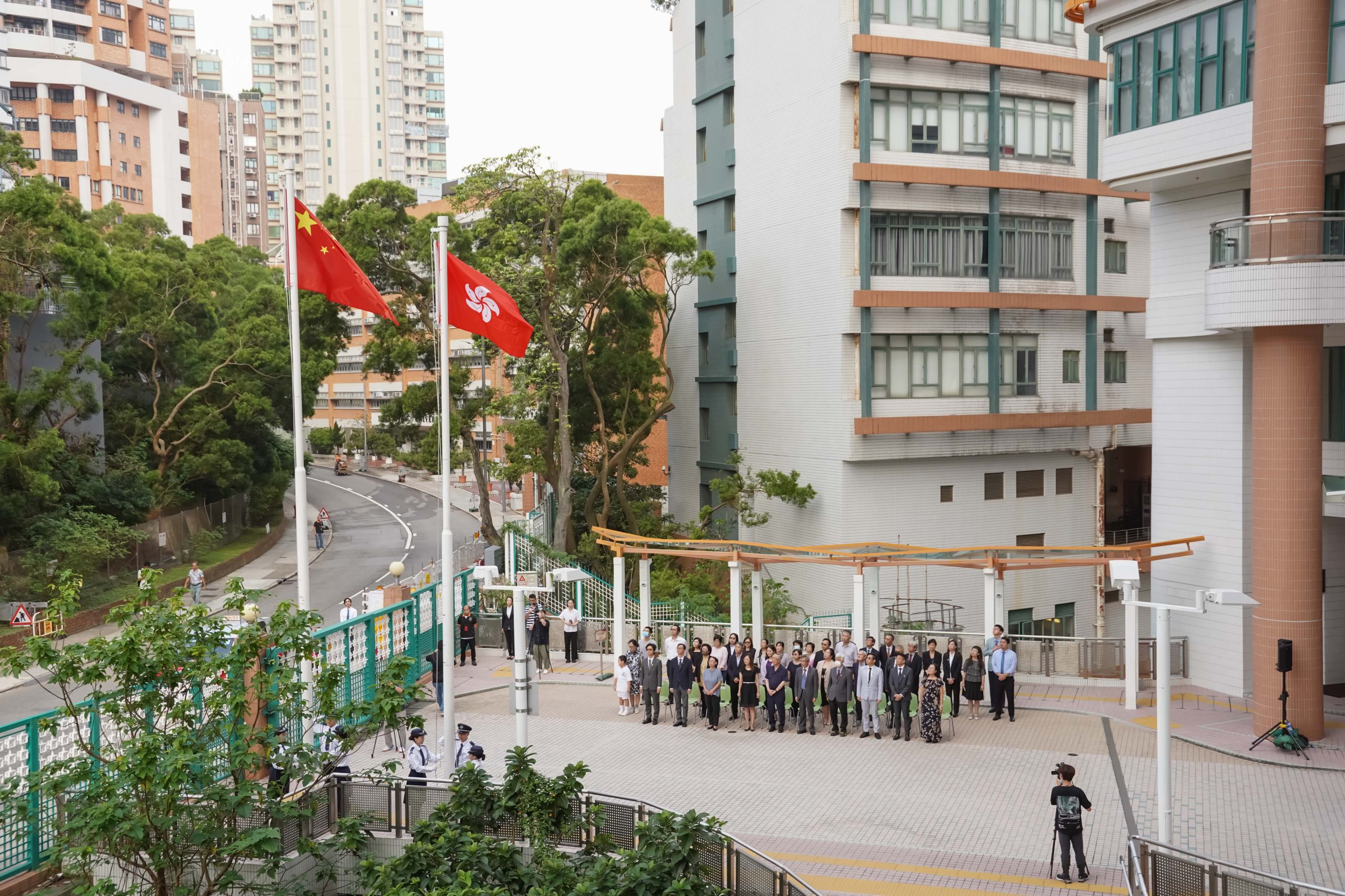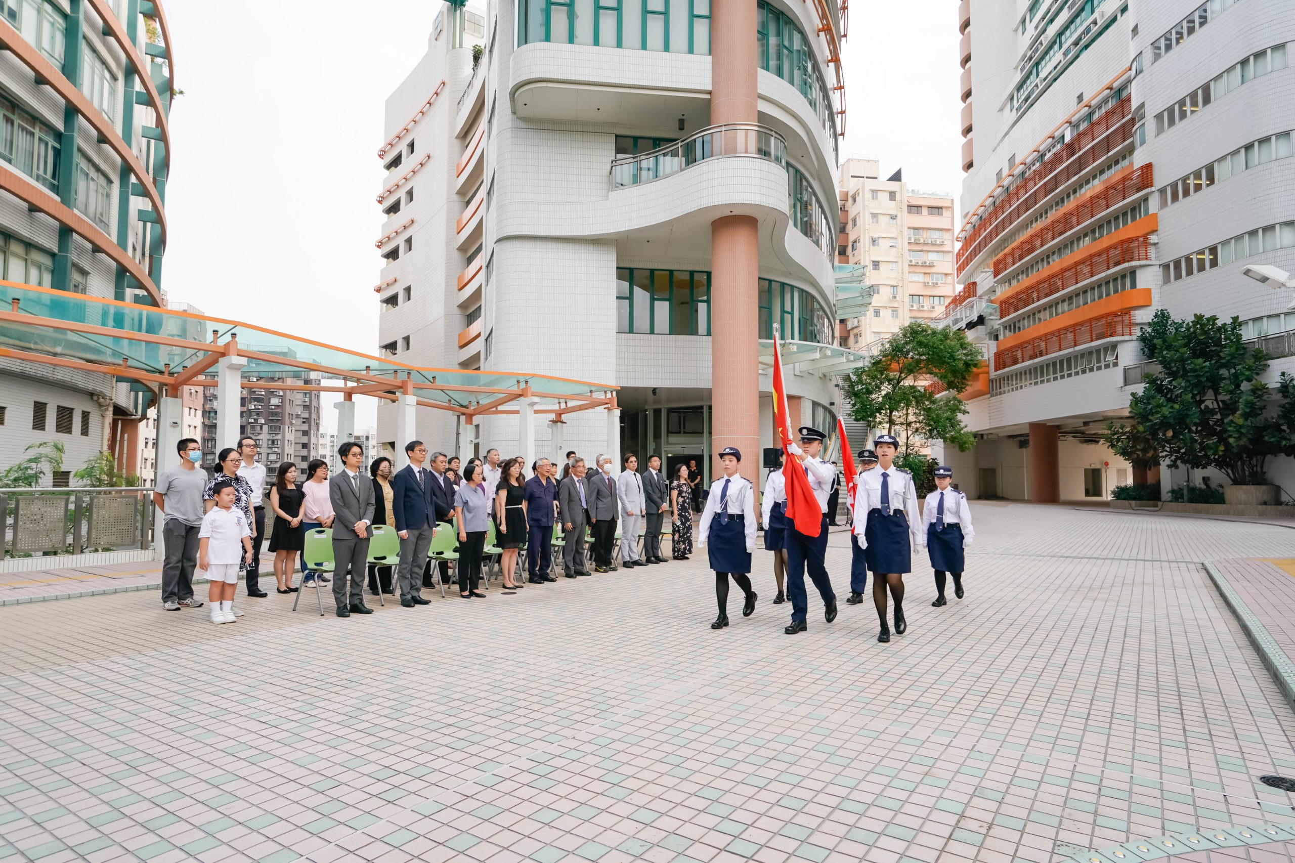 香港樹仁大學舉行國慶日升旗儀式,主禮嘉賓包括校務委員會主席黃錫楠教授、學務副校監胡耀蘇教授、常務副校監胡懷中博士及各大學管理層成員。