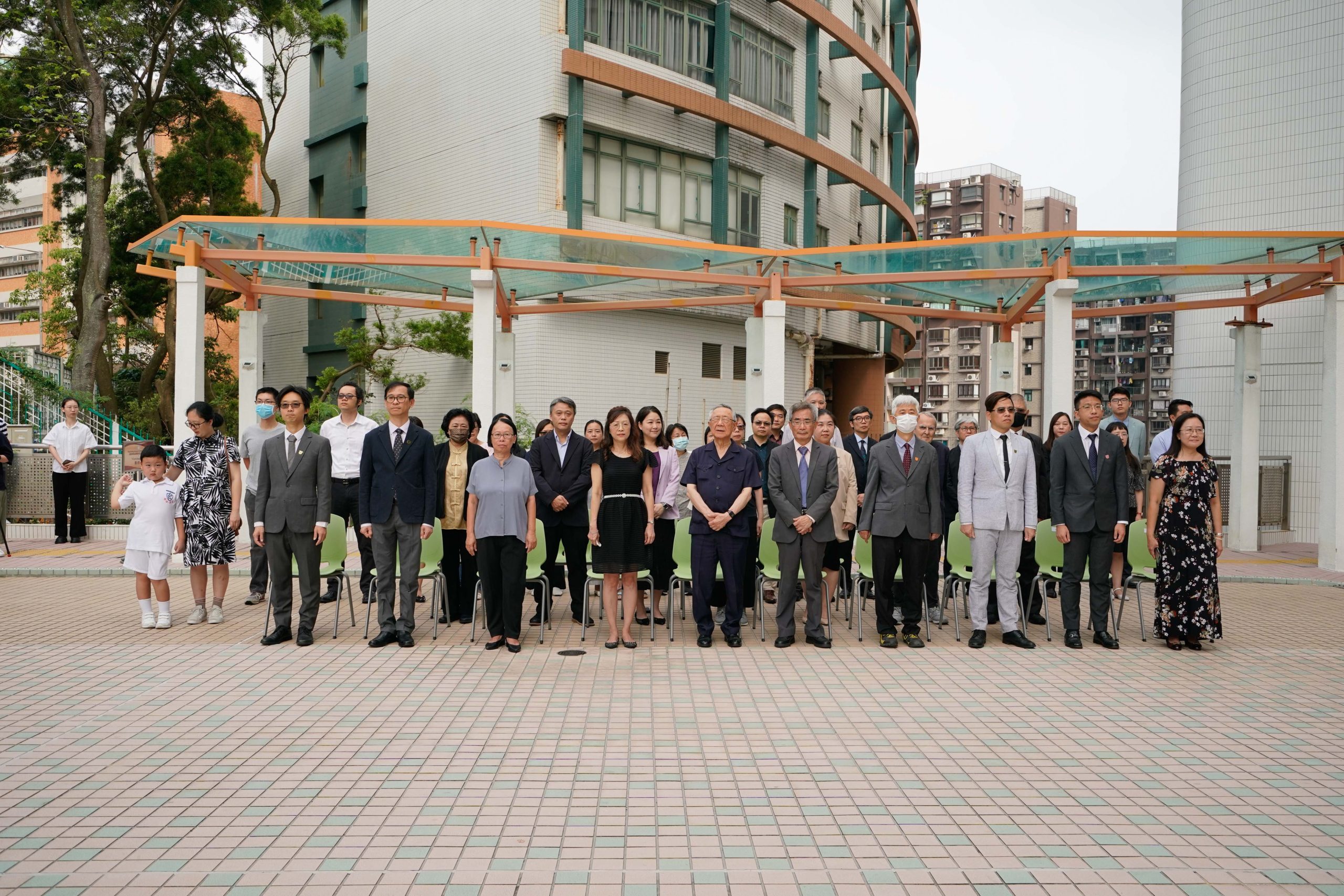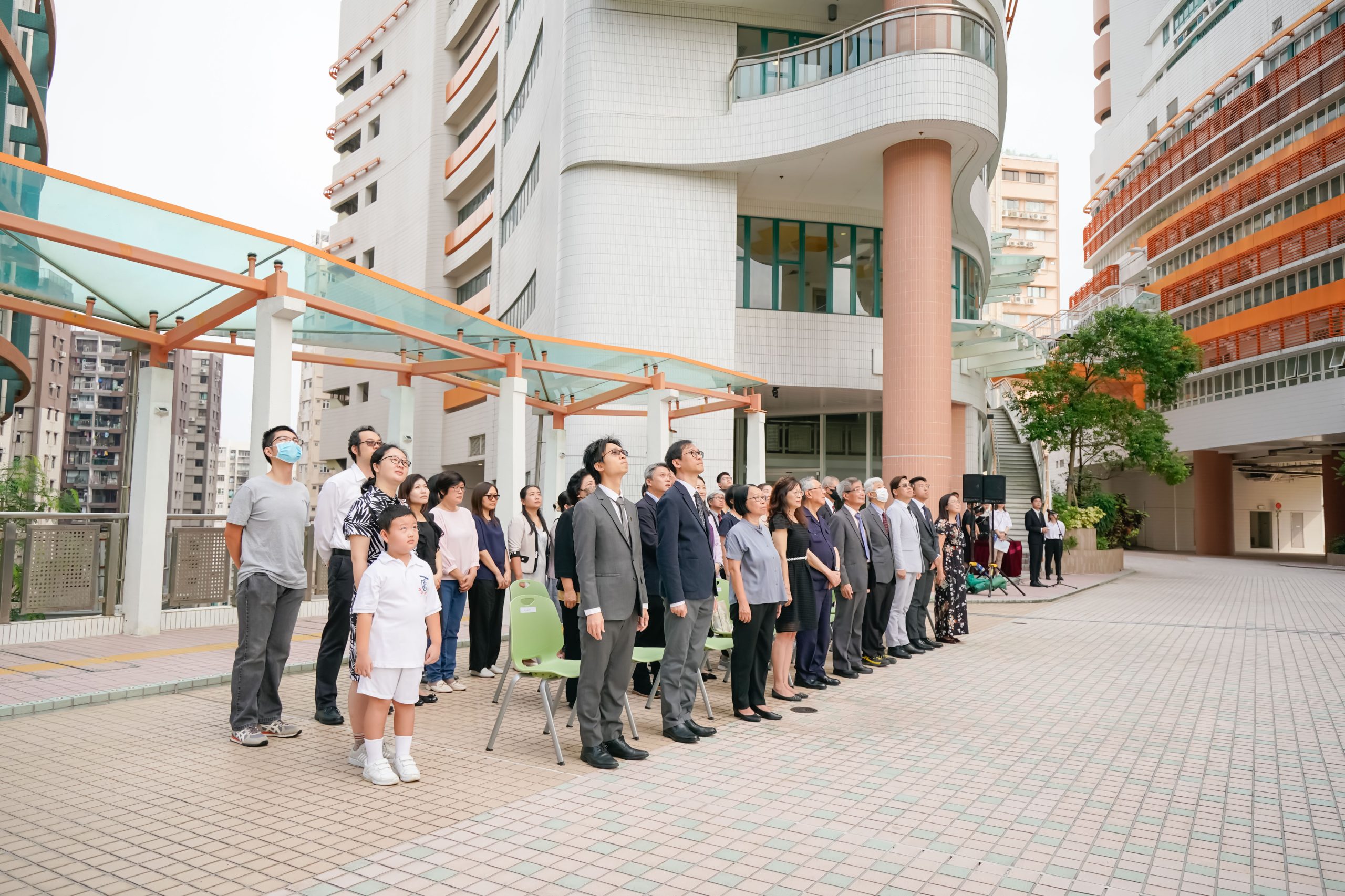 香港樹仁大學校務委員會主席黃錫楠教授(前排右五)、學務副校監胡耀蘇教授(前排左五)、常務副校監胡懷中博士(前排右四)、學術副校長陳蒨教授(前排左四)、行政副校長張少強教授(前排右三)、副校長(研究院)鄧素琴教授(前排左三)、協理學術副校長(評審及學科發展)許耀峰教授(前排左二)、署理協理學術副校長(教學發展)周德生博士(前排右二)、協理學術副校長(大學研究)李允安博士(前排左一)、協理副校長(學生事務)葉秀燕(前排右一)以及各大學管理層成員、教職員及學生出席升旗禮。