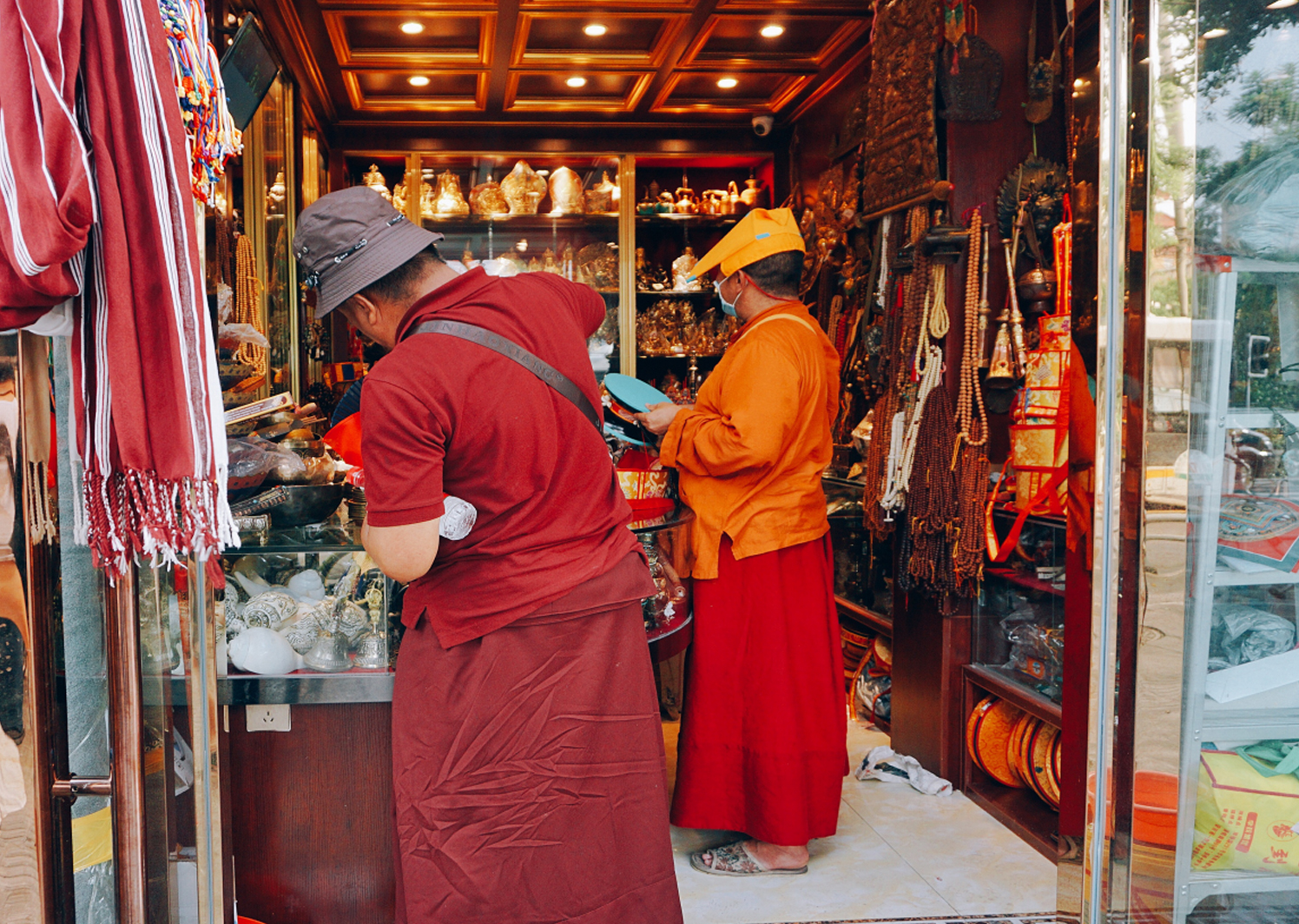 相比於在文殊院、寬窄巷子或錦里裡的遊人踵踵,在成都,我更喜歡在街頭巷尾發現最貼地的生活節奏。也許是下午兩點在店裡用竹絲編織手工袋的茶店老闆娘,也許是半夜一點在路面燒烤攤「擼串」的年輕人。有些時候的亂逛會帶我發現一些更奇特的色彩。從遊客必到三國裡「桃園結義」的武侯祠裡出來後,我發現側街上是帶來是滿眼紅色金色。仔細一看,這處似乎是屬於藏族人聚集的地方。店鋪裡賣的是藏族服飾,還有些佛珠、轉經筒和藏香之類。站在路旁的也是皮膚黝黑的藏族人,有身披紅布的喇嘛,也有帶著色彩斑斕綠松石耳環的婦女。他們的樣子明顯有別於本地人。 不遠處播放著的藏傳佛教的誦經聲,讓我頓時有種穿梭到拉薩八廓街的感覺。後來了解到,因為地緣上的相近,成都裡聚集著一批來此謀生的藏族人。 藏語裡並不說巴適,但也許這條為「異鄉人」們找到短暫的歸屬的街,是屬於他們暫駐此地的「巴適」吧!