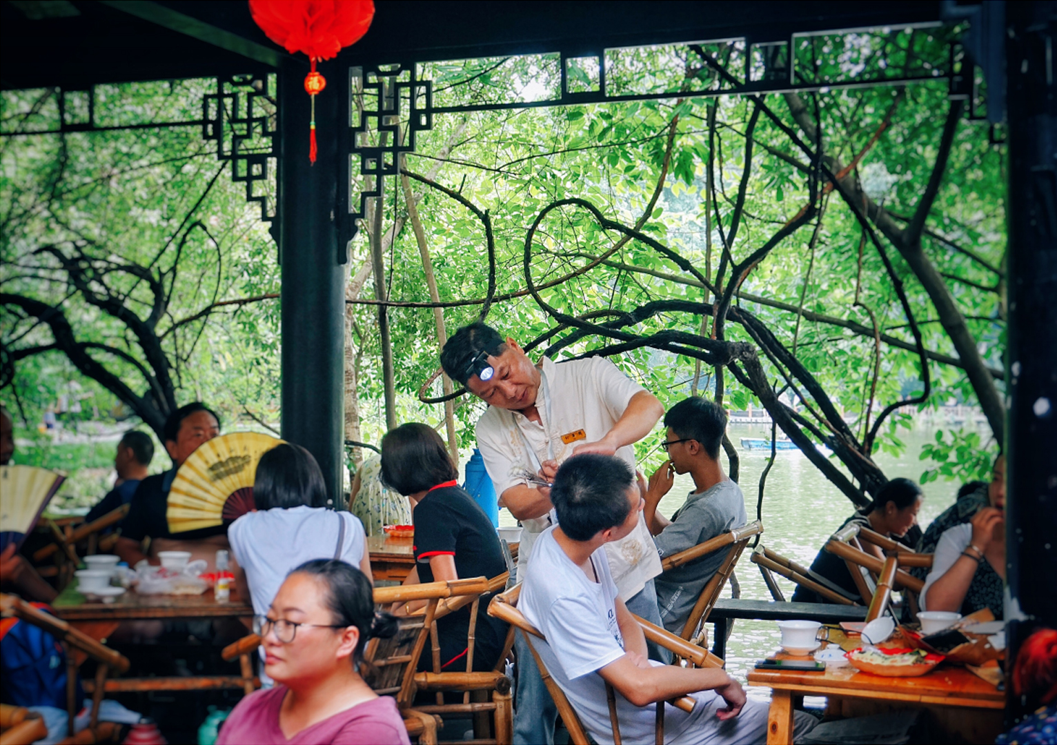 如果重慶的巴適來自於酣暢爽快,那成都的巴適則更多是在不急不緩中醞釀。常在書中見作家以一聲蟬鳴道一個盛夏,但常住在鋼筋都市中又聽得見幾回?而藏在成都這城市道路兩旁的樹叢裡是猶如交響樂般的蟬鳴,我算是第一回這樣真切感受到。每天跟隨著本地人慢悠悠的腳步走在街上,頭頂的聲響此起彼伏,有時似綿綿絮語,有時卻震耳欲聾,這聲響中是一股於城內高樓汽車相陪襯的生命力。酒店房間裡的詩集,也有許多本地詩人對蟬聲的描寫感悟。鶴鳴茶社裡,有揮扇吃茶嗑瓜子的大爺,也有貪新鮮體驗一番「小爽爽」的人。「小爽爽」是當地人對掏耳朵的俗稱,似乎有些不衛生,也有些危險,但從顧客神緊張又帶笑的神情裡可以知道,這也許是當地人尋找專屬他們的「小確幸」的方式吧。有時候反過來想,每天都公正規矩地過活,埋頭學習工作中後便是回家吃飯睡覺,缺乏點綴的生活未免是會無趣的。不要求每天轟轟烈烈,但如果能學會從平靜生活裡發掘能夠帶來小趣味的消遣,是一種生活的藝術。我想,在享受「小爽爽」的人心裡也會念著,「巴適」!
