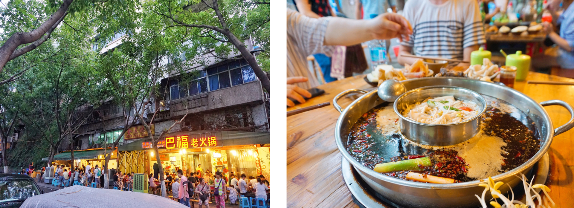 而晚餐的火鍋更是讓我看到更上一層樓的爽快。傍晚六時許,天色將黑未黑,本地人已圍坐在街邊的露天火鍋店大快朵頤。重慶夏日 38 度的高溫似乎絲毫沒有減退當地人對火鍋的熱情。敞著肚皮,涮著火辣的食物,毫不拘束地與友暢談,但也喝著冰凍的「唯怡」豆奶來給這熱度加點兒調適。這就是「生活氣息」吧!若說江南菜的精緻細膩吃出了吳儂軟語,那麼我想這重慶菜的濃醇刺激造就了重慶人性格的熱情爽朗。隔壁桌的男人一見就知道是外地來的,問完我們從哪裡來,便熱情地分享火鍋的底料如何調味道最好,再推薦值得遊覽的地方。許多時候,到一個未曾駐足的地方,探索的最好方式不是寫在書上手機裡的攻略上,而是來自於土生土長當地人的閒談裡。鍋裡熱氣升騰,我捕捉著汗裡被風扇吹出的一絲涼意,再道:「巴適!」