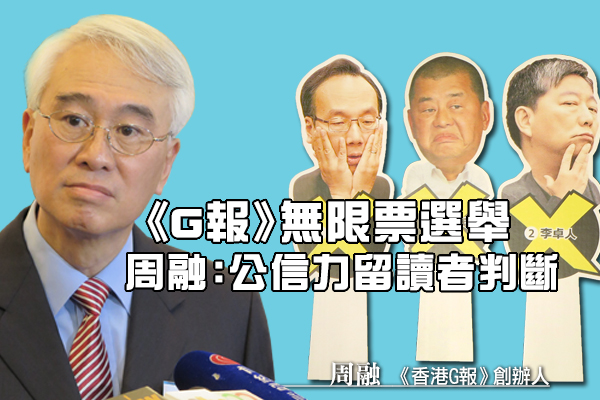 周融亦不忙呼籲政商界集資二三十萬投資《香港G報》,一年有二、三百萬就足夠支持一個網媒,多一把聲音。酒會上舉行了一個簡易而隆重的儀式,公佈早前香港G報舉行的「誰是真/冇普選面孔選舉」,票數最高的三甲包括李卓人、黎智英和梁家傑,以三人巨型頭像紙牌,迎戰政改三人組的紙牌,現場氣氛熾熱。