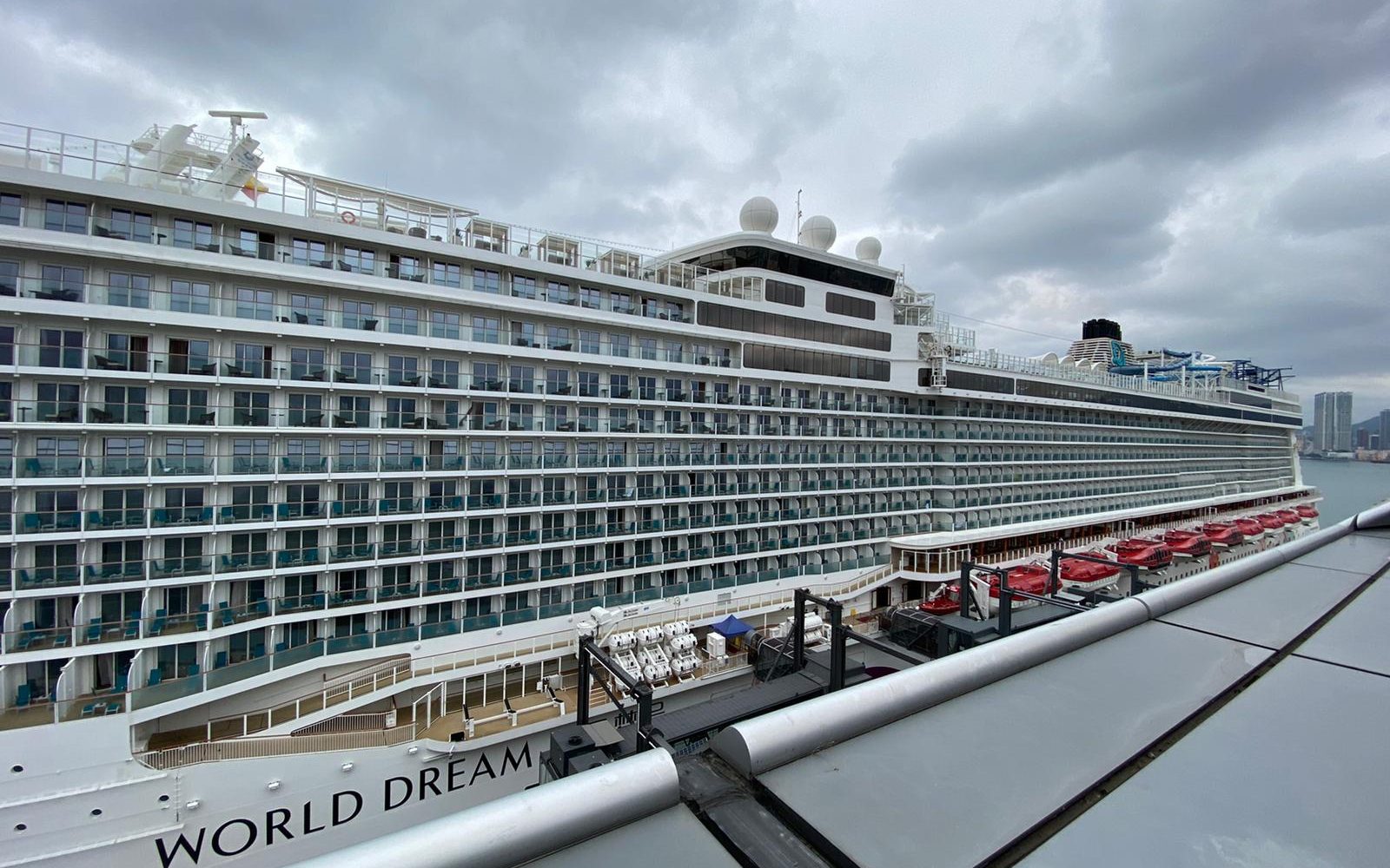 上月曾接載3名確診新型肺炎內地旅客的郵輪「世界夢號」,乘客昨日在台灣高雄被拒上岸,郵輪今早返港,停泊在啓德郵輪碼頭。