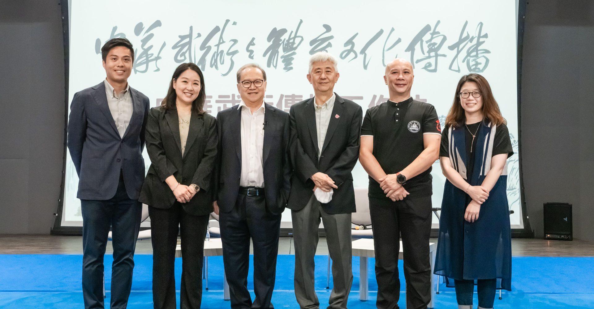 「中華武術與體育文化傳播」項目贊助人單偉彪(左三);香港樹仁大學常務副校監胡懷中博士(右三);「中華武術與體育文化傳播」項目主理人、香港樹仁大學新傳系系主任李家文博士(左二);詠春體育會主席李煜昌(右二);「中華武術與體育文化傳播」項目聯合研究員、香港樹仁大學新傳系發展與傳訊總監何戎笙老師(左一);「中華武術與體育文化傳播」項目策展人、仁大校友彭芷敏(右一)。