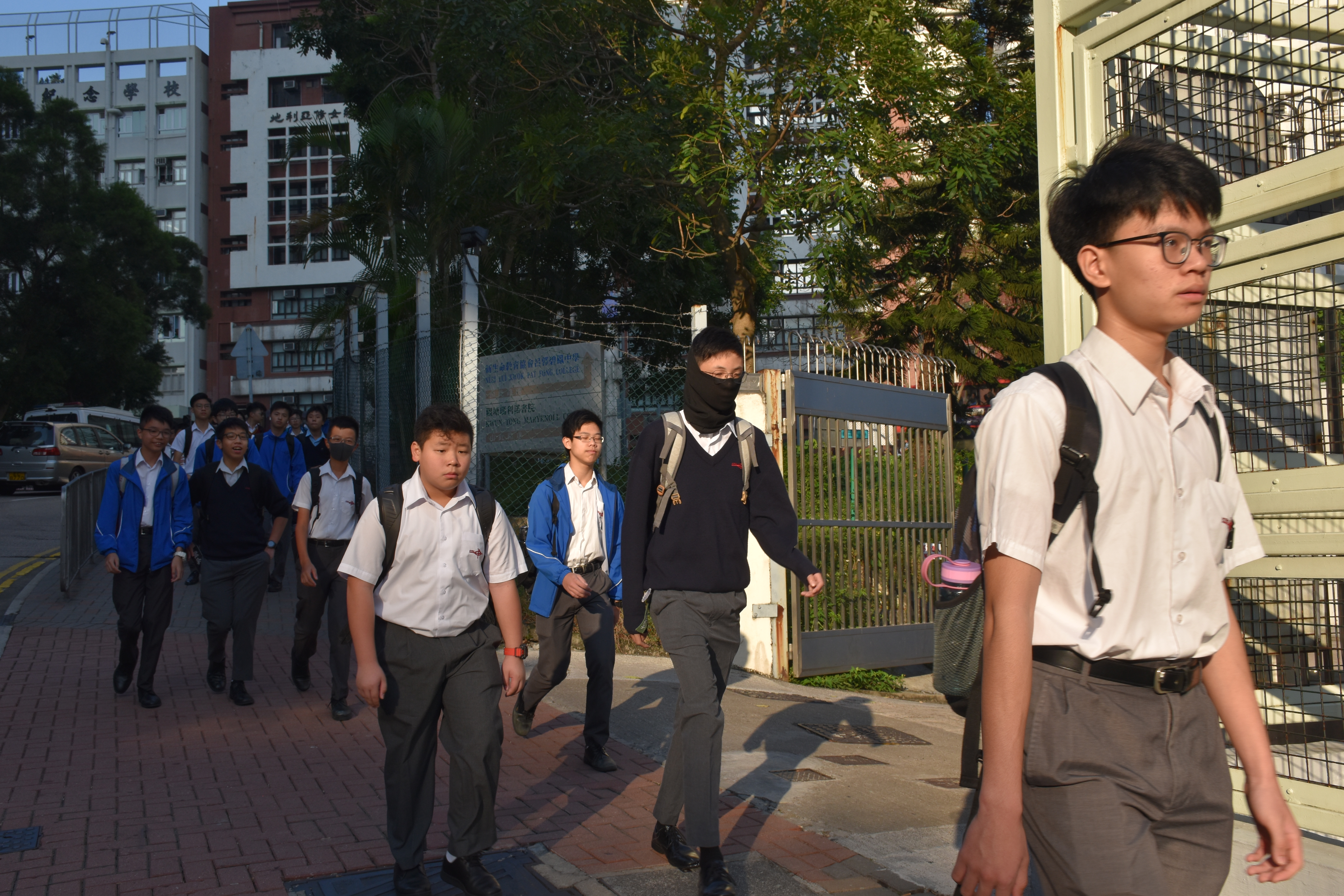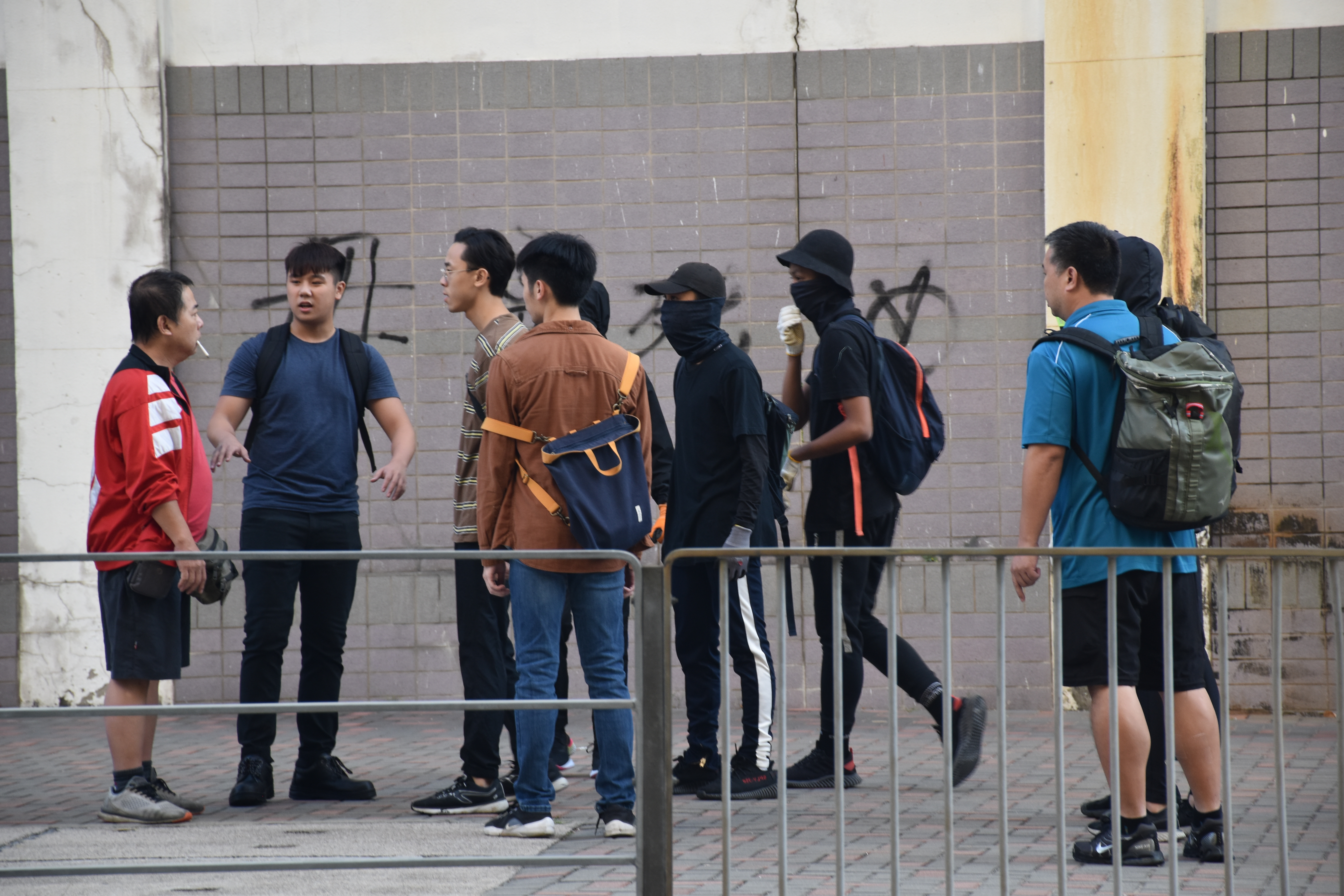 早上八時,一批黑衣人在兩間學校門外以水馬等雜物堵路,拆毀路邊的鐵欄。一名身穿紅色外套的男子與黑衣人爭拗,並由市民勸喻散開。