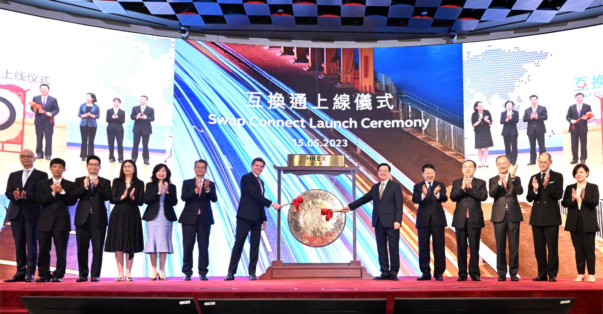 主圖片:行政長官李家超上午在「互換通」上線儀式上與其他嘉賓主持敲鑼儀式。左6起:財政司司長陳茂波、香港交易所集團行政總裁歐冠昇、行政長官李家超、中央人民政府駐香港特別行政區聯絡辦公室副主任尹宗華、財經事務及庫務局局長許正宇、香港金融管理局總裁余偉文