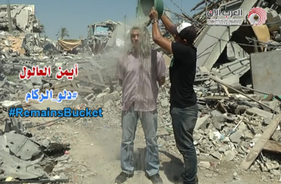 在加沙,一名土耳其的人道救援人員,仿效「冰桶挑戰」用一桶瓦礫黃土向頭淋。該救援人員表明,冰桶挑戰是要感受病人痛苦。而他自己則要用滿身塵土向世人揭示,巴勒斯坦兒童每天擔驚受怕,炮火隨時毀滅家園的悲痛與恐懼。另外,有土耳其志願組織義工帶同4名小童,響應自倒瓦礫的挑戰,希望為巴勒斯坦民眾出分力。