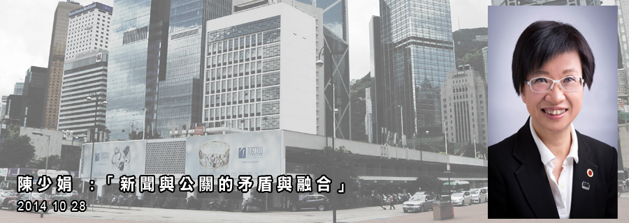 大學校園 「新聞與公關的矛盾與融合」 October 24, 201401163 陳少娟 公共傳理顧問有限公司首席顧問 2014年9月-12月舉辦之學系周會講座 Related 【10.24】田北俊建議梁振英請辭 Previous Post 無處不是周永康 Next Post