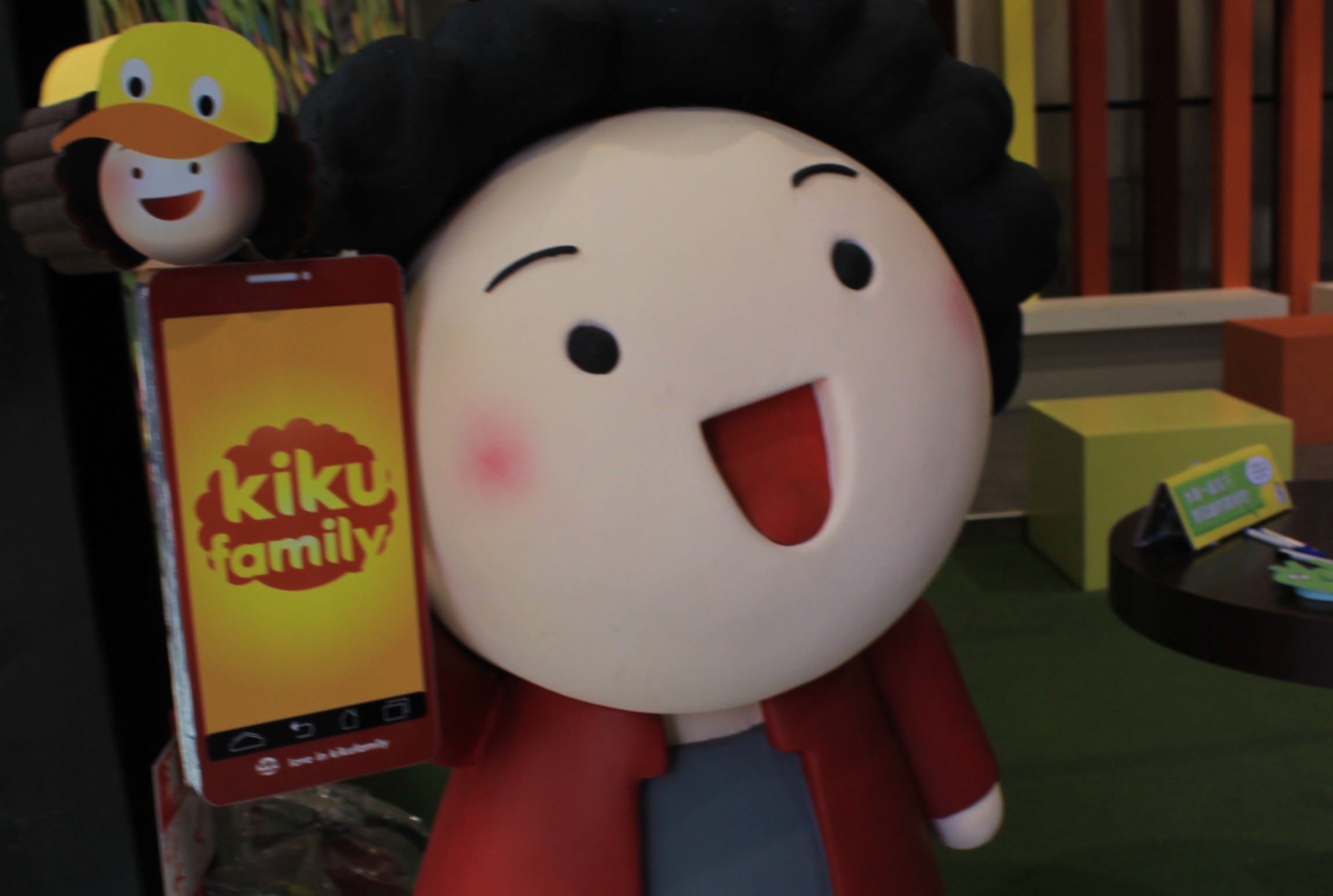 競選總部附近的大高雄願景館設有多陳菊卡通造型「花媽」吸引支持者。(葉詩穎攝)