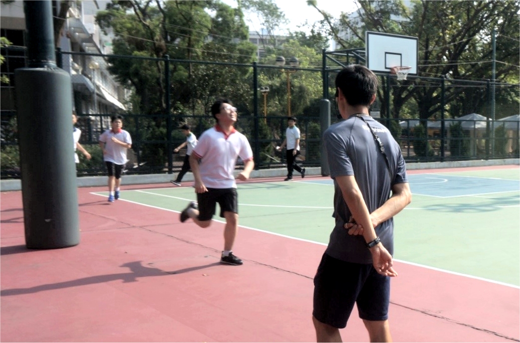 到達籃球場後,他立刻把握時間叫同學做熱身運動。在烈日當空下,球場沒有遮掩,只有陽光下數條燈柱的陰影。同學們怕熱怕辛苦,都不想跑動。