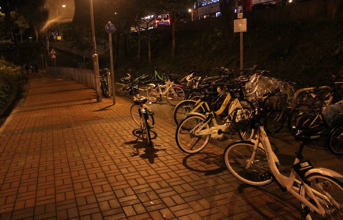入夜後,共享單車亂泊的情況更嚴重,影響行人通過。