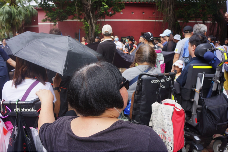 遊行起步時,隊頭的「直幡」先行,輪椅人士隨後。