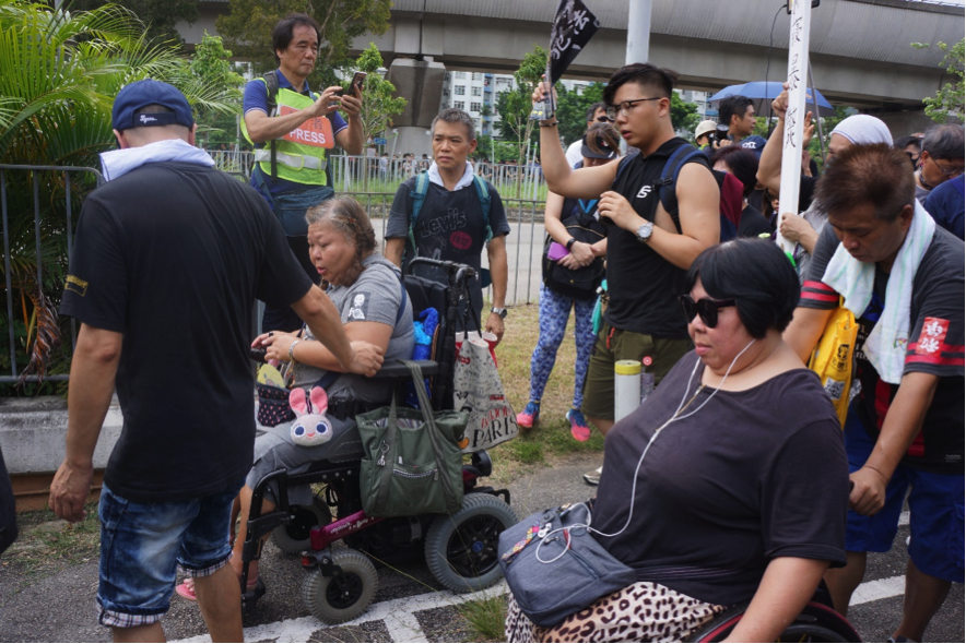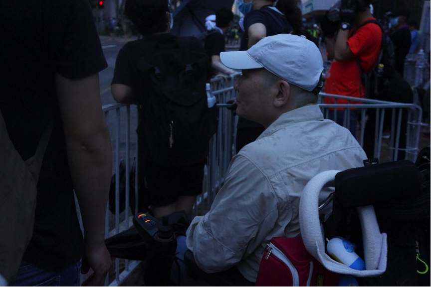 遊行人士與警方對峙的一刻,輪椅人士上前關心,雖行動不便,但無阻支援的心。