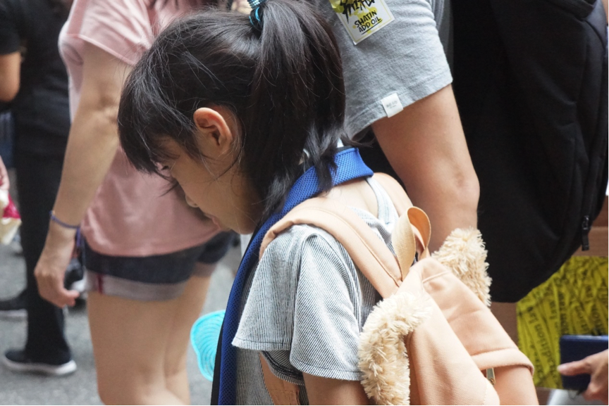有小朋友熱得要家長協助貼上「退熱貼」,但仍堅持要走下去。