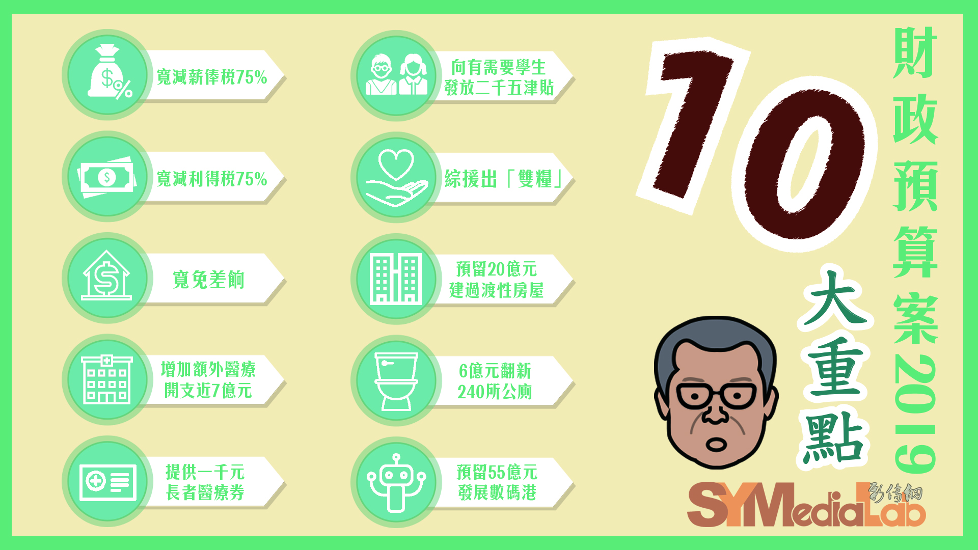 社會新聞 【圖解】財政預算案十大要點 February 27, 201901431 製圖:莊宛珊 Related 預算案寬減75%薪俸稅上限2萬元 Previous Post 預算案預留55億元發展數碼港第五期 Next Post