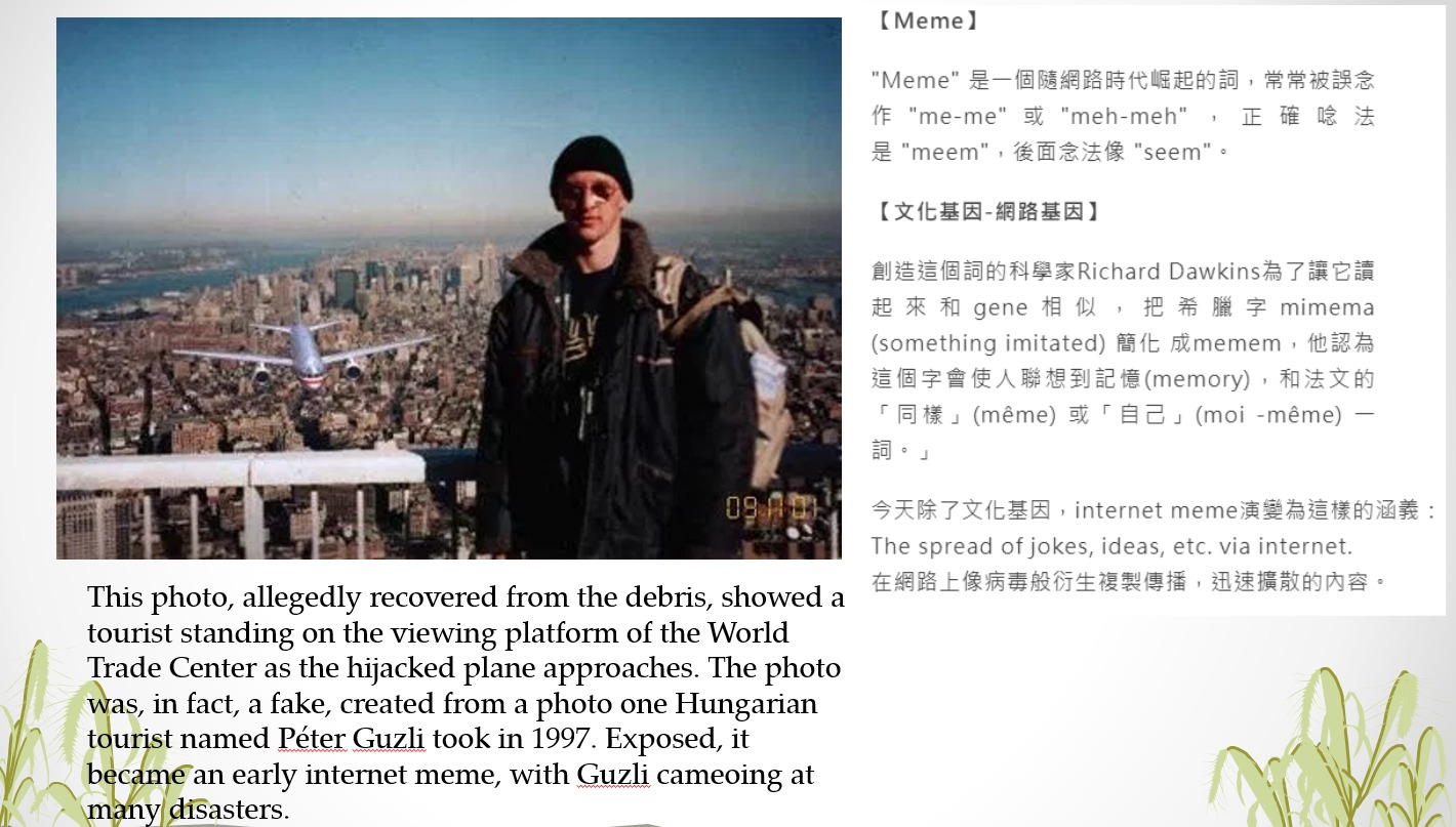 另外,講採寫也不忘提醒同學們,網上資訊太多太雜,一不小心就中伏了,怎辨識是記者和編輯功力的試金石,想當年meme這字爆紅,網上流傳許多九一一相關相片,真的嗎?或只是網絡上一些常客操弄的改圖?meme中文是指「網絡上爆紅事物」的意思,在重大新聞事件發生時更催生這類事物,Internet memes就是指「一夕之間透過網絡散播而爆紅的人、事、物」,通常都能夠引起人們共鳴⋯⋯若得到傳媒助攻,可以想像漫天飛舞的是謠言還是事實?小心!小心!小心!