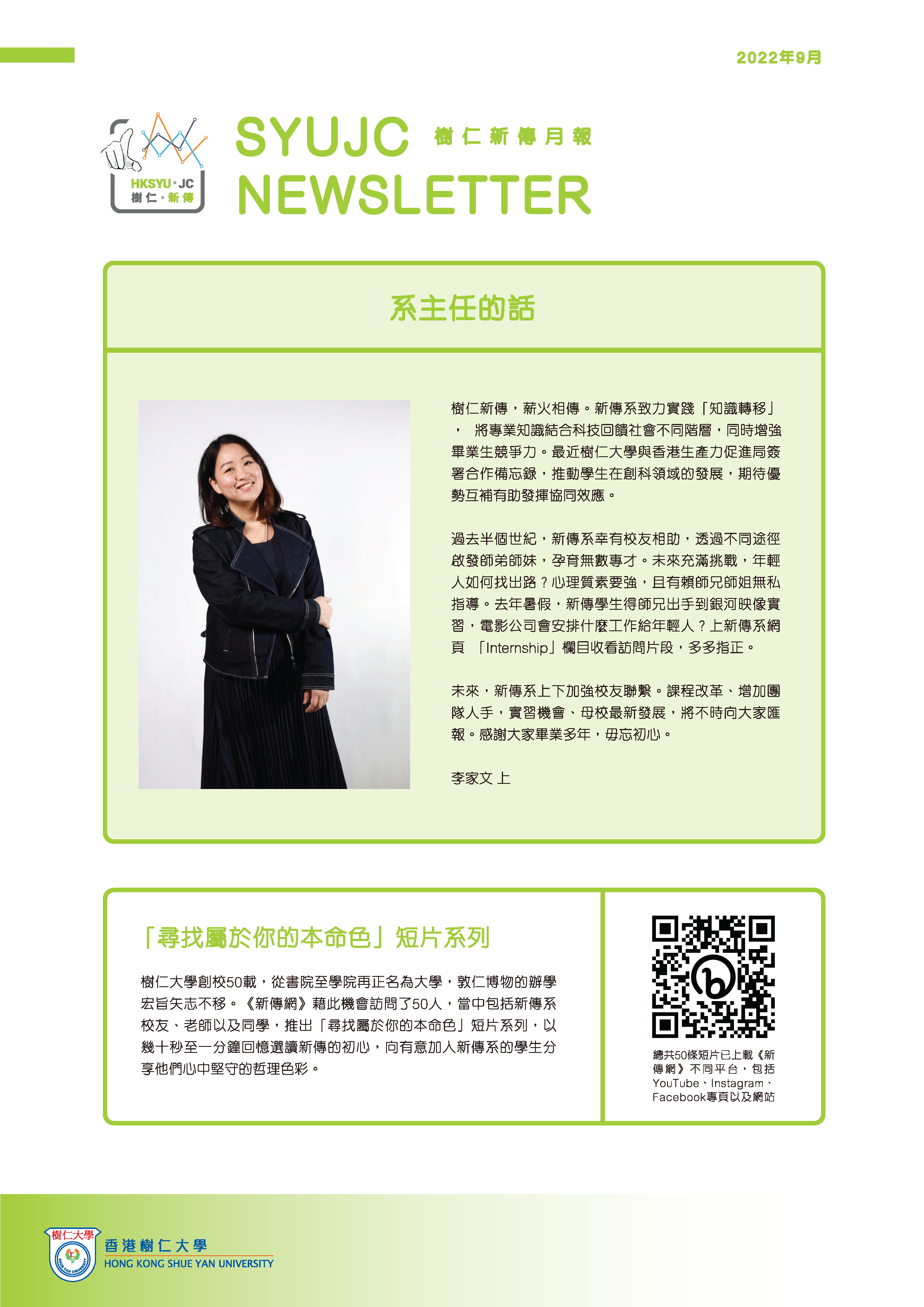 新傳系系主任李家文撰文表示,學系致力實踐「知識轉移」,將專業知識結合科技回饋社會不同階層,同時增強畢業生競爭力。她又指出,最近仁大與香港生產力促進局簽署合作備忘錄,推動學生在創科領域的發展,期待優勢互補有助發揮協同效應。