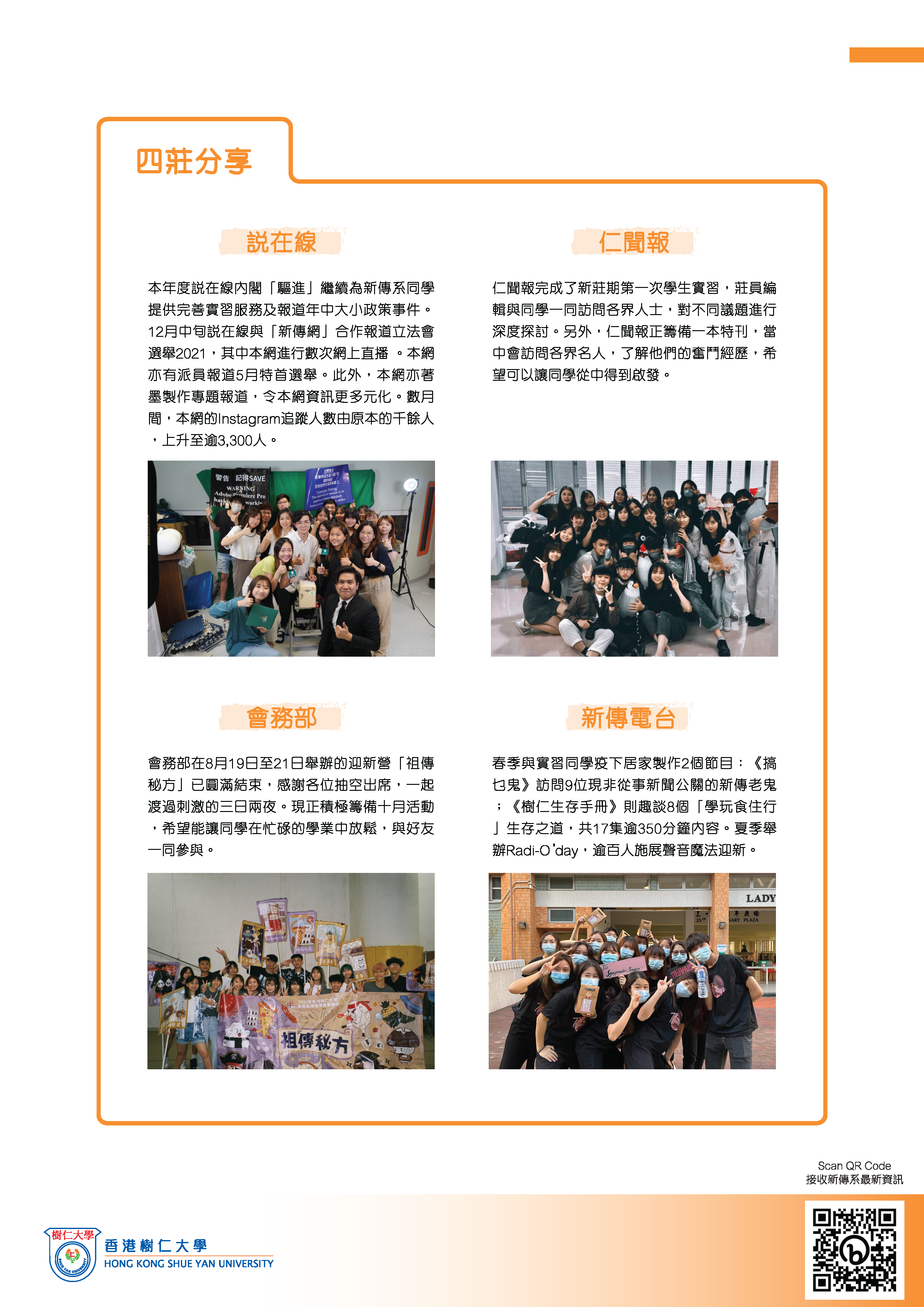 香港樹仁大學新聞與傳播學系由本月起新增《樹仁新傳月報》,將系內師生教學、硏究、活動等資訊進一步對外發放,目標包括校友、學界等。