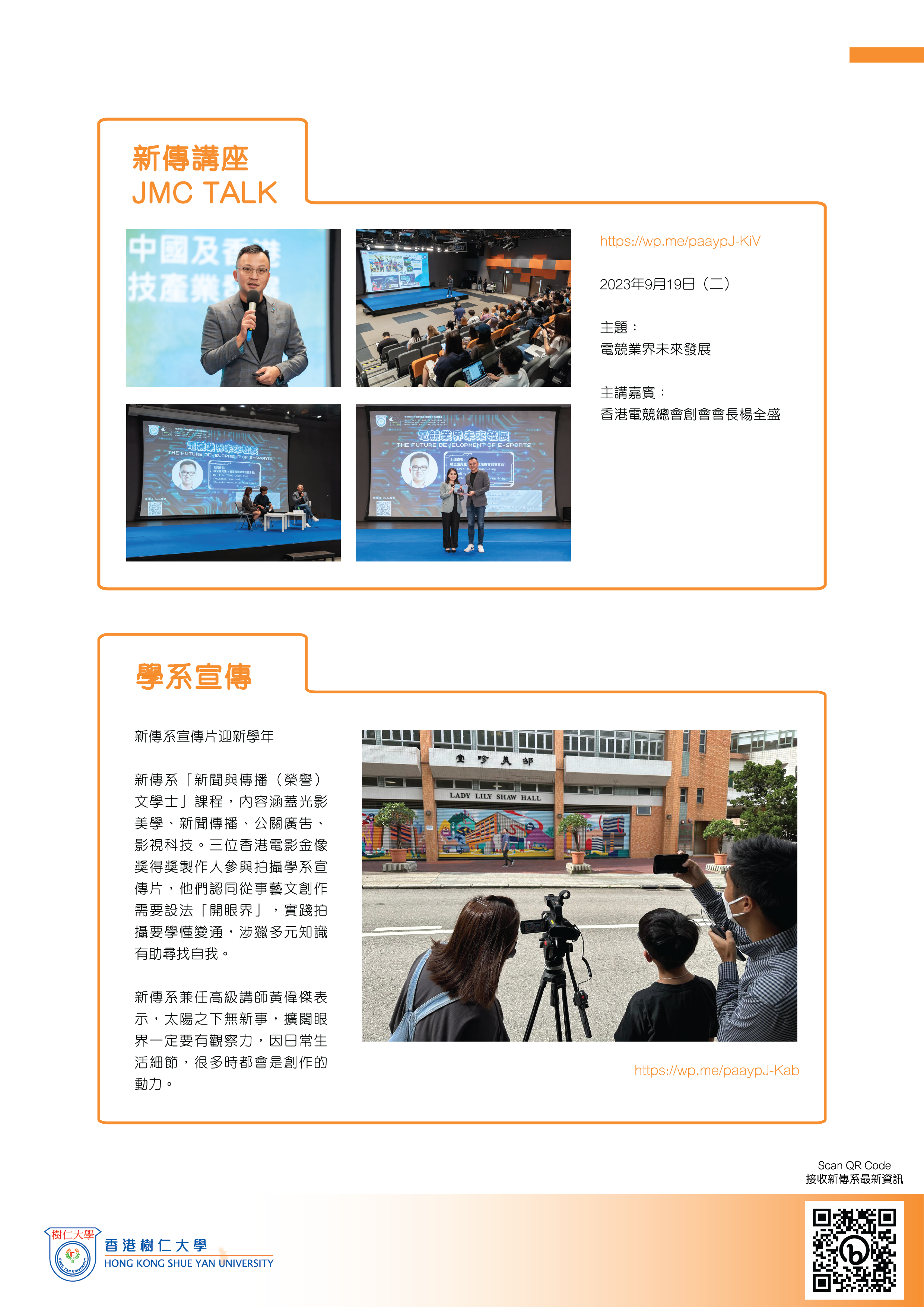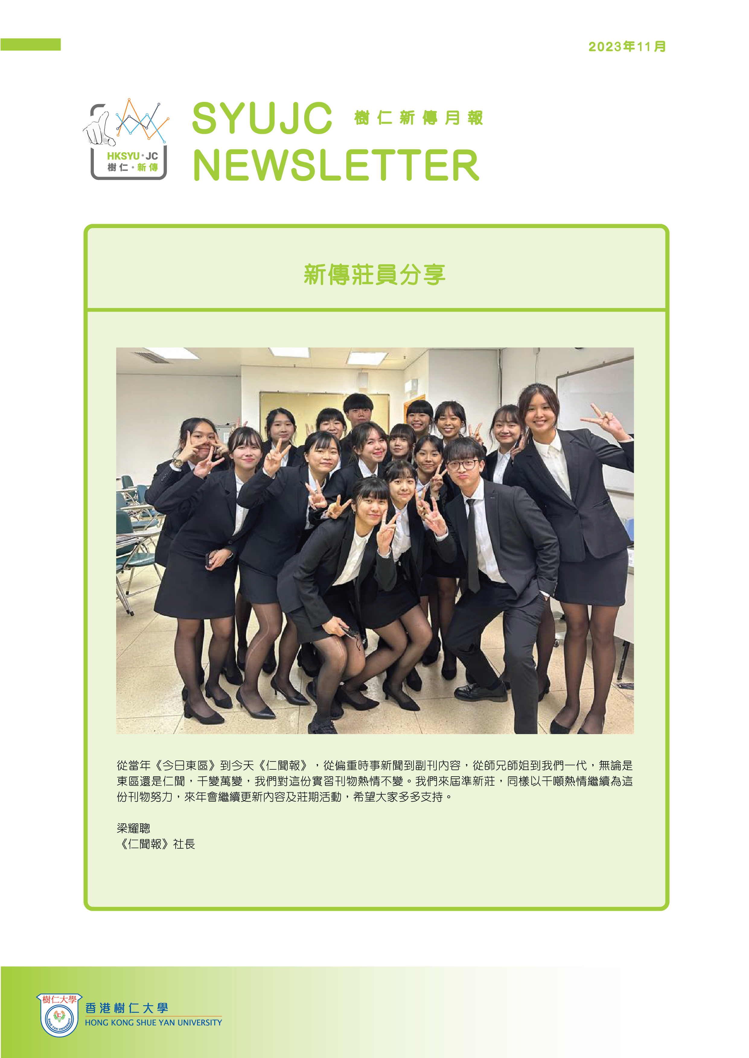 校園活動樹仁新傳月報編輯推介 【樹仁新傳月報】2023年11月號 November 10, 202304562 香港樹仁大學新聞與傳播學系刊出《樹仁新傳月報》十一月號,校內實習組織之一的《仁聞報》,社長梁耀聰撰文表示,從當年《今日東區》到今天《仁聞報》,從偏重時事新聞到副刊內容,從師兄師姐到現今一代,「莊員」對這份實習刊物熱情不變,希望各界繼續支持。 《樹仁新傳月報》十一月號,第一頁。 《樹仁新傳月報》十一月號,第二頁。 Related Related tags : 仁聞報梁耀聰楊全盛樹仁新傳月報黃偉傑 金管局與人行和澳門金管局同意三方金融科技監管工具聯網對接 Previous Post 甯漢豪指雖有土地流標但政府造地決心「不能動搖」 Next Post